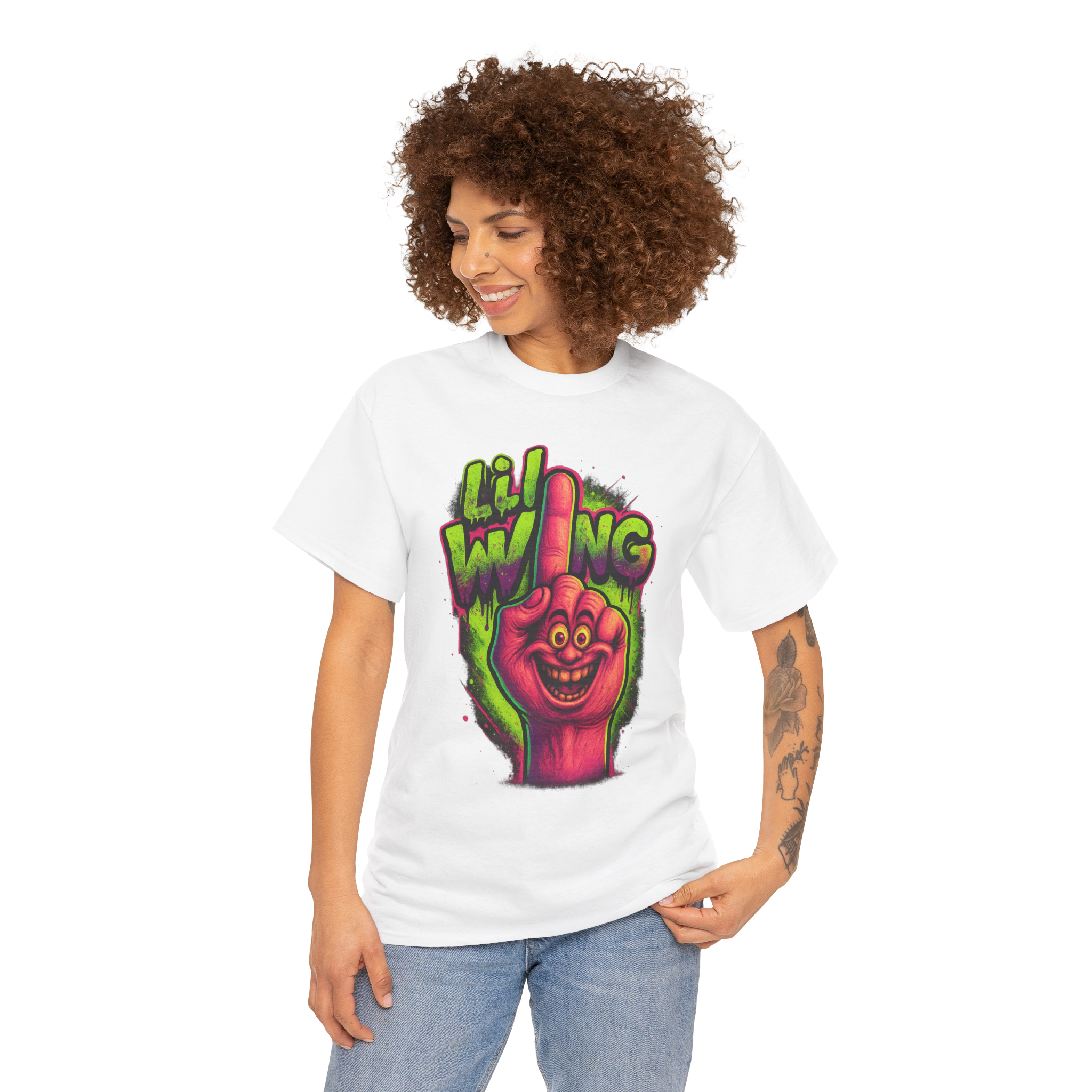 With a maniacal smile and a slime-dripped backdrop, this t-shirt flips convention the bird with a colorful, chaotic twist.