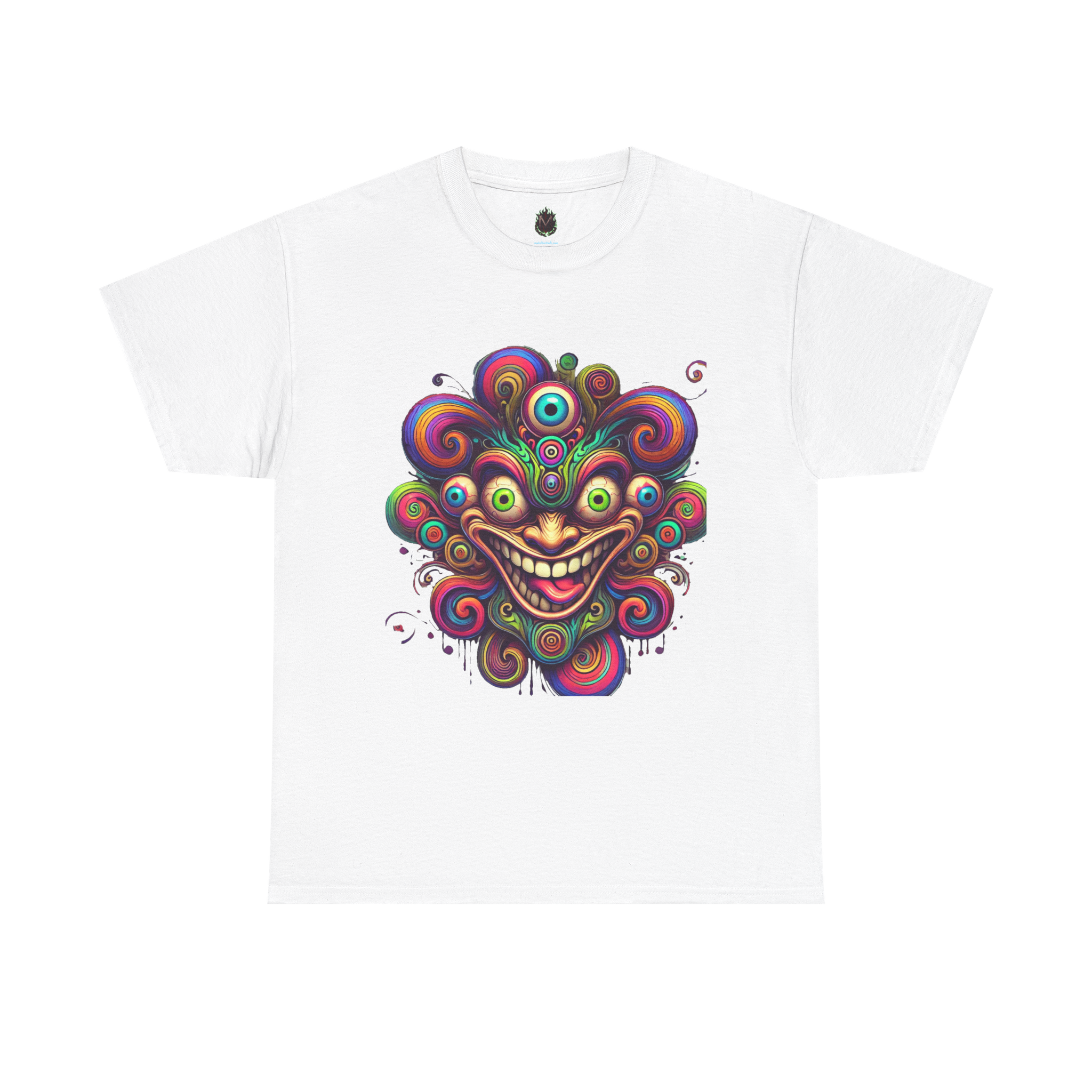 Dive headfirst into a psychedelic nightmare with this vivid, chaotic design. A giant, warped smile stretches across a surreal face built from swirling eyes and trippy spirals — dripping, grinning, and staring all at once. This design is for those who embrace the madness and wear it proudly.