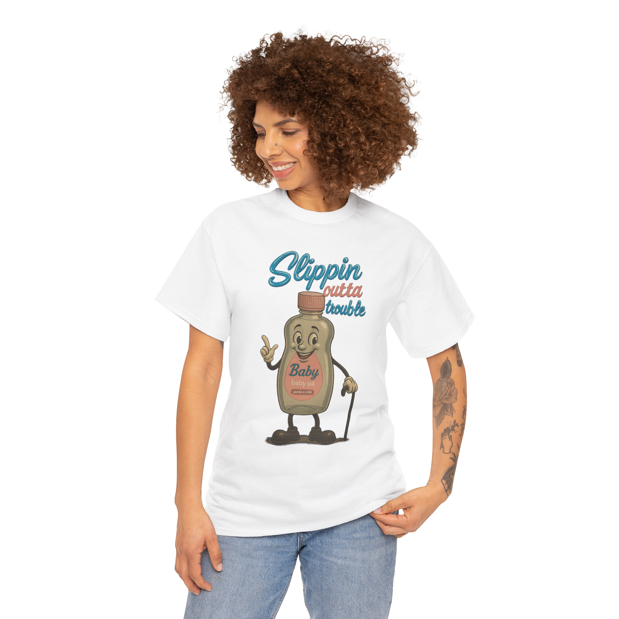Step back in time with this quirky "Slippin' Outta Trouble" t-shirt featuring a charming cartoon baby oil bottle that's full of character.