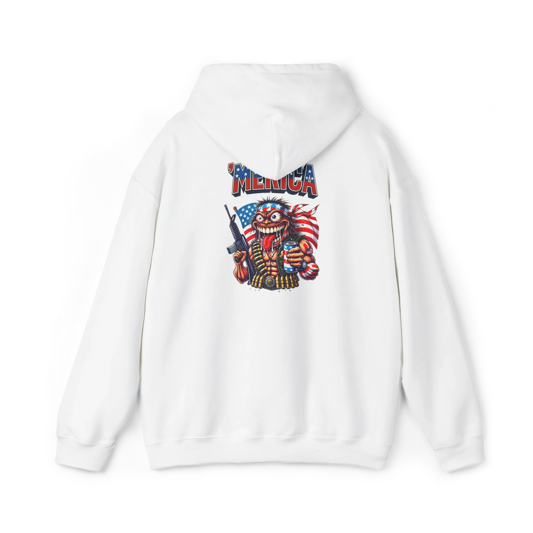 'MERICA – where your monster is wrapped in a flag, armed to the teeth, and drinking beer with a crazed grin. This hoodie turns your loudest instincts into wearable anarchy.
