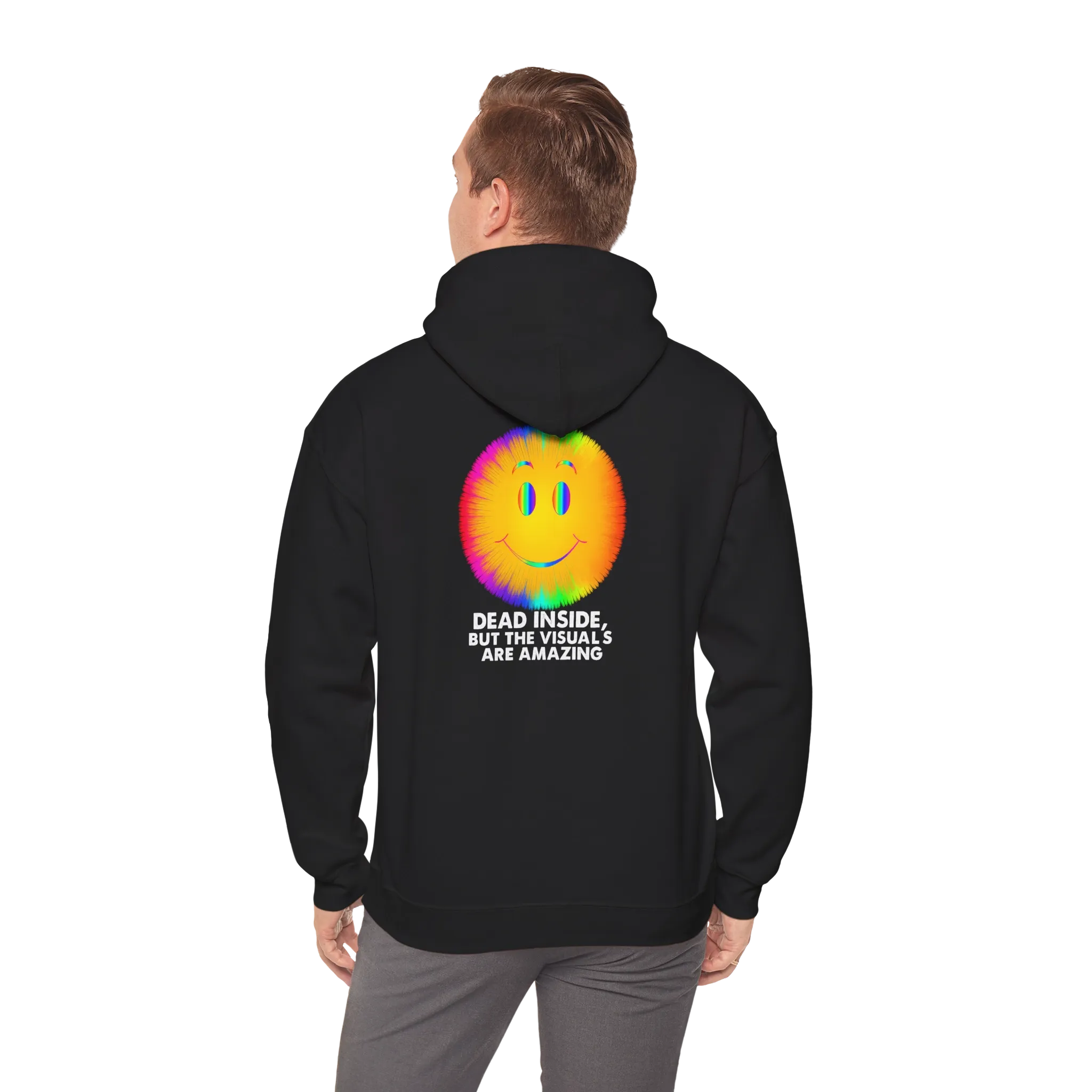 The Dead Inside But the Visuals Are Amazing Hoodie hits right in the neural cortex. With a trippy neon smiley face bursting with glitchy rainbow vibes, this is the go-to piece for overstimulated souls coasting on chaos. A visual sugar rush for the emotionally comatose.