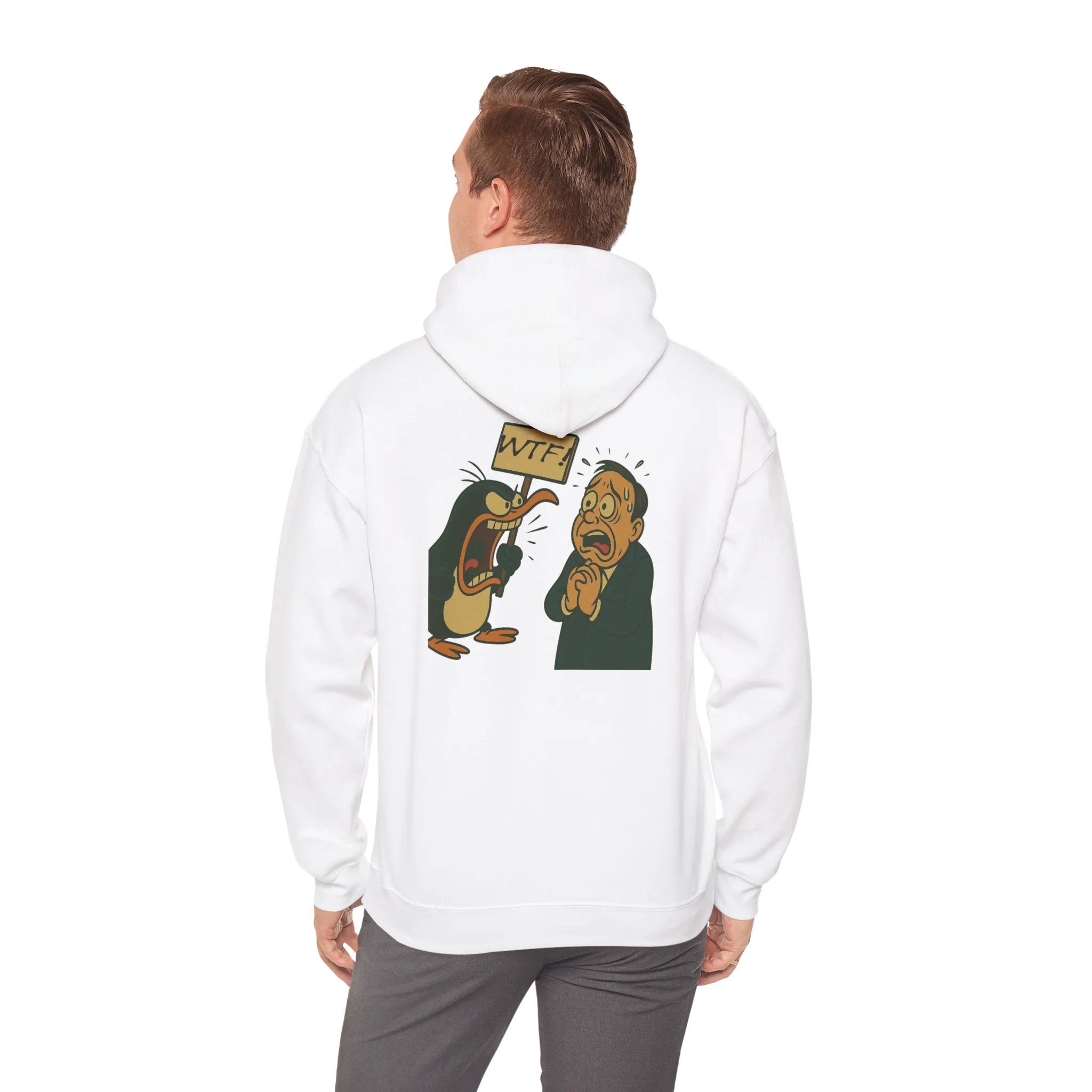 WTF Penguin Rage brings chaotic energy to your wardrobe. Featuring a screaming cartoon penguin holding a “WTF” sign while confronting a terrified man, this back-print design captures the exact moment before you snap… but in a funny way.