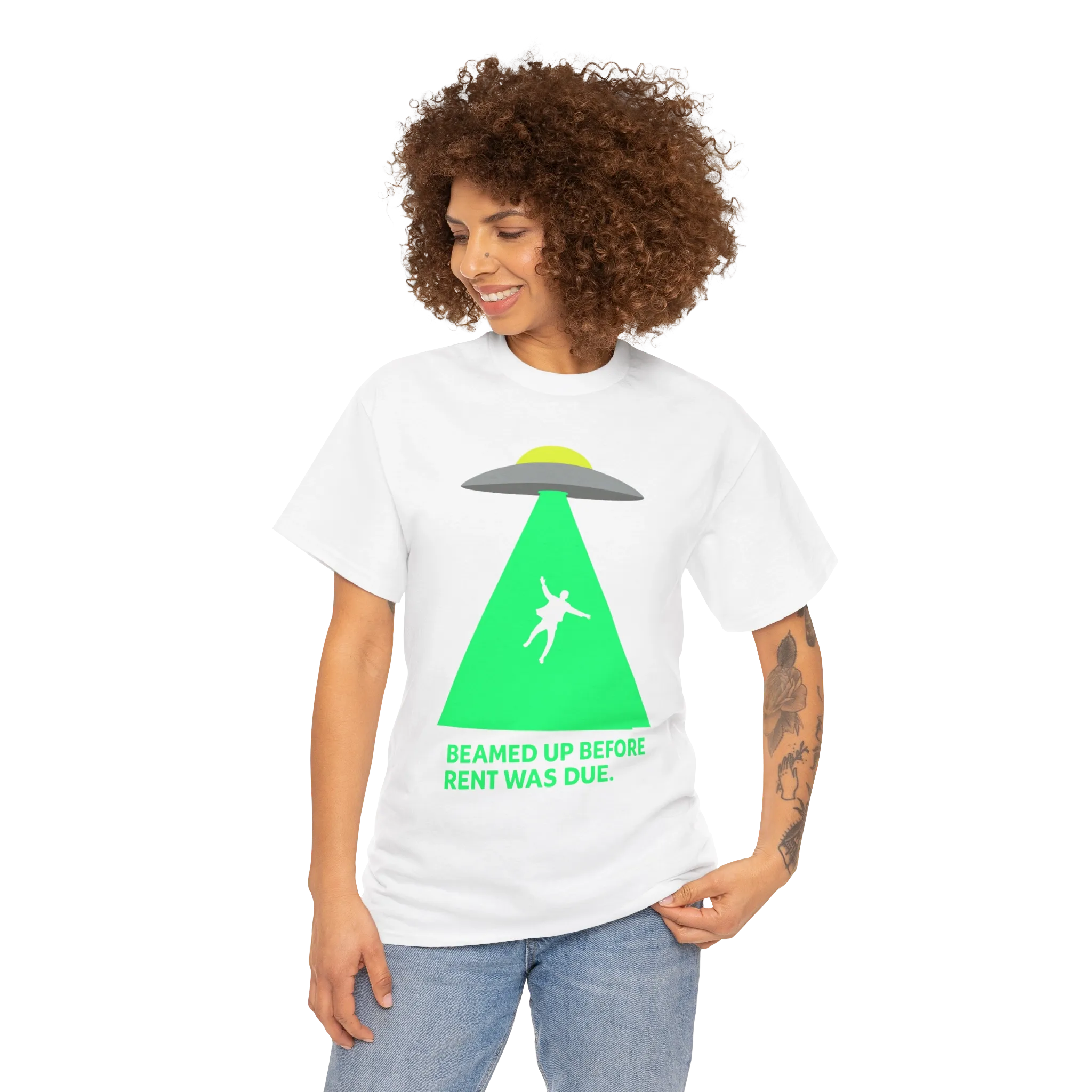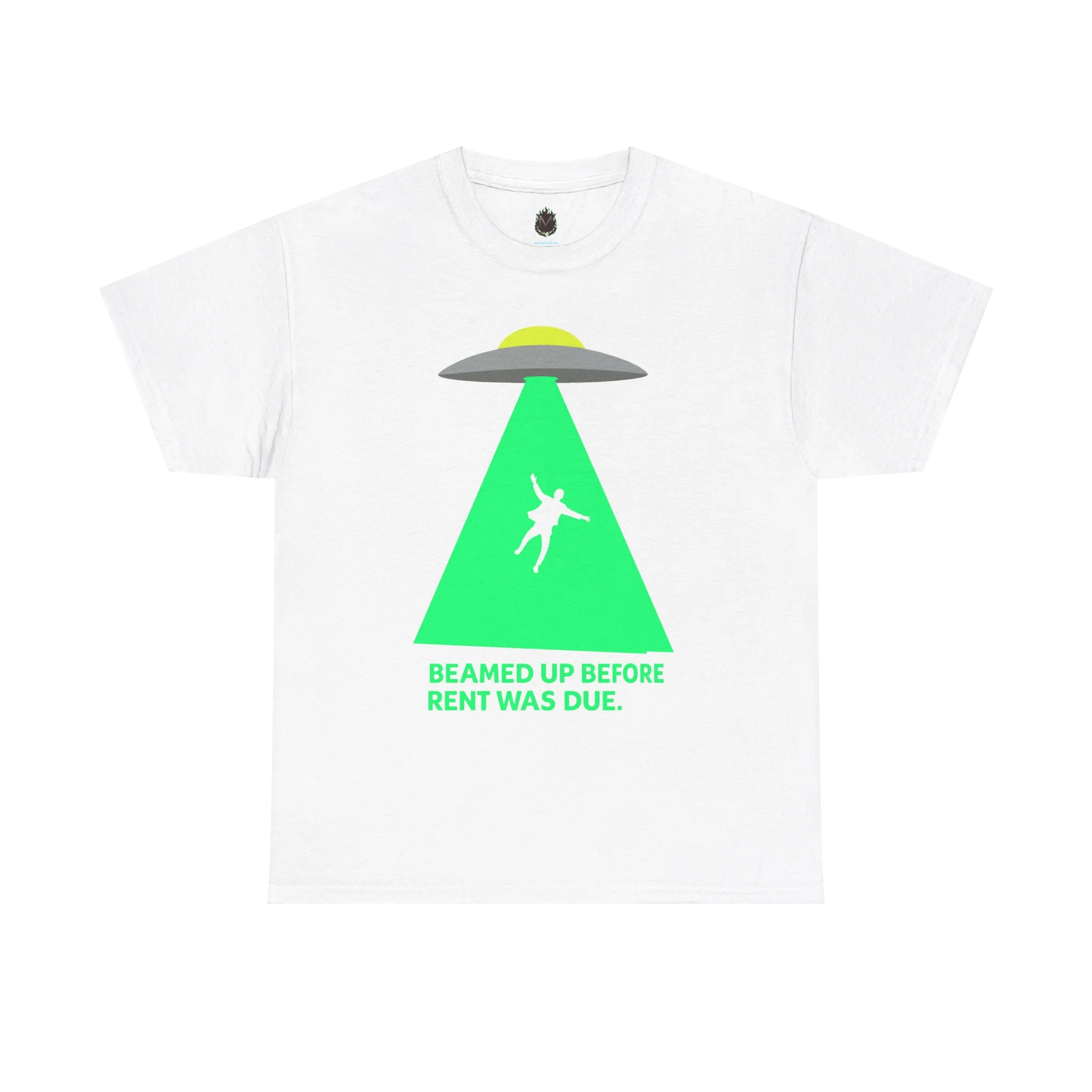 This tee captures the spirit of every broke dreamer and intergalactic freeloader — abducted just in time to avoid adulting. The green beam of hope is strong in this one.