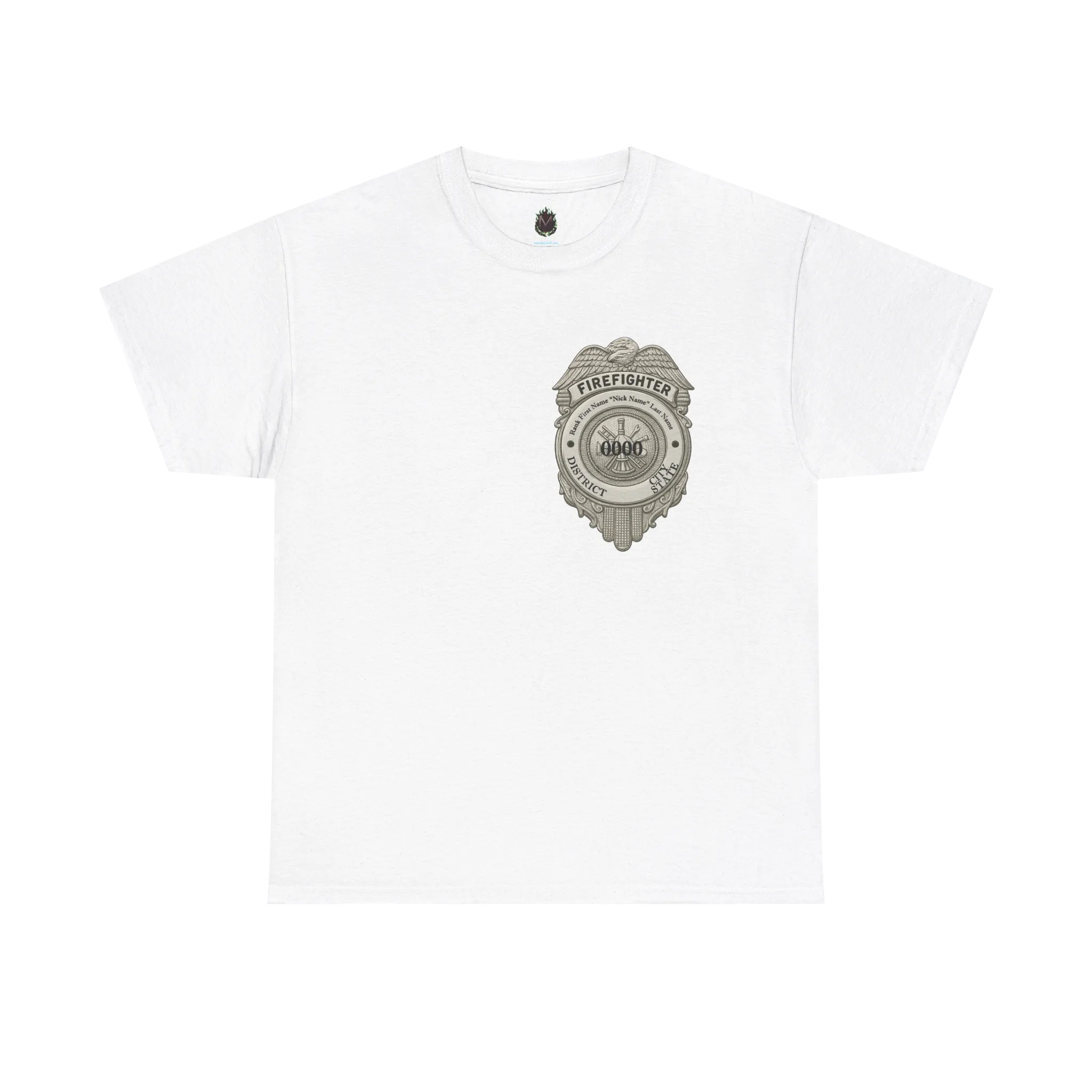 This double-sided firefighter tribute tee features a detailed badge emblem on the front and a poignant scene on the back: a firefighter overcome with emotion, comforted by a child, set against the glow of a fire.