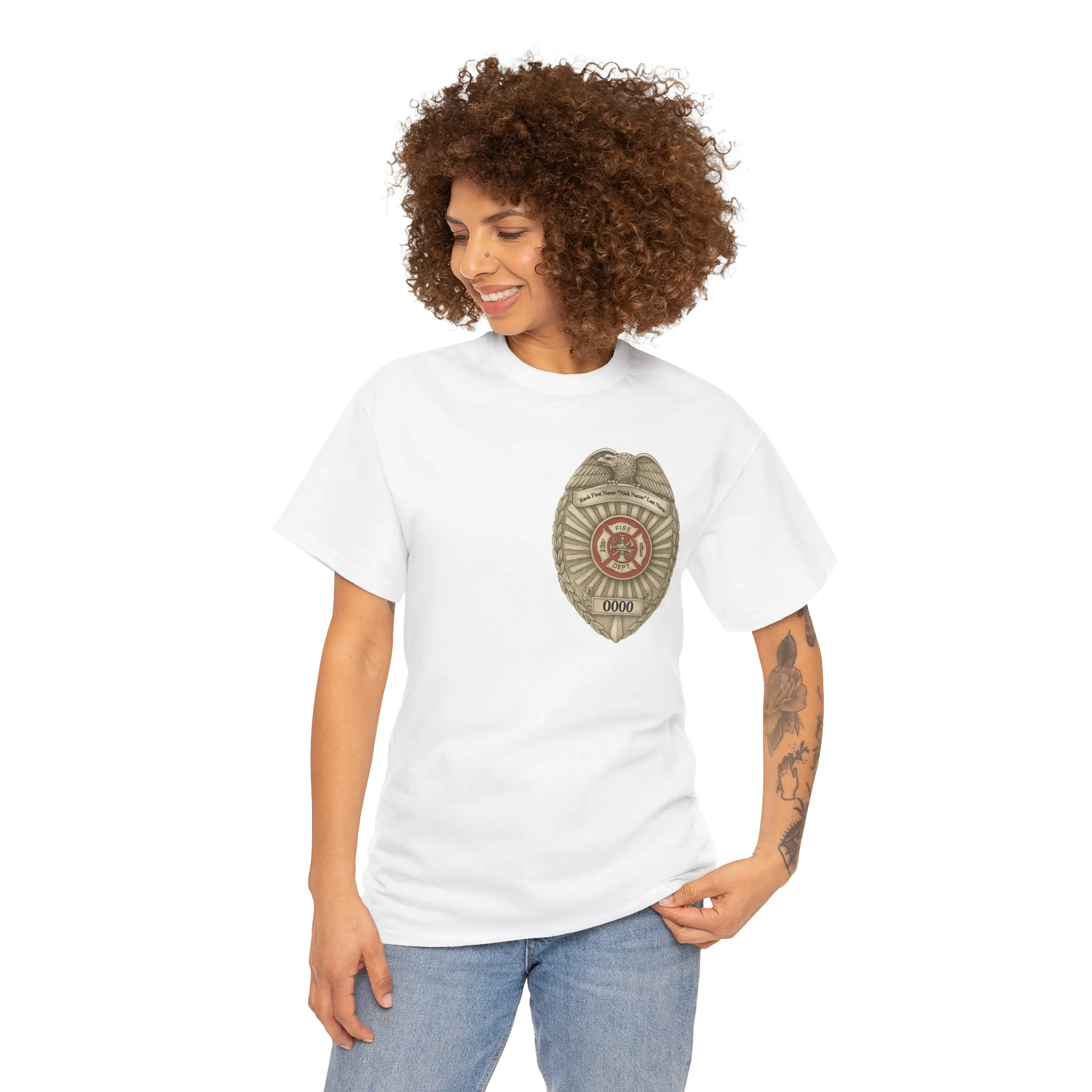 This double-sided firefighter tribute tee displays a vintage badge on the chest and a bold back print featuring a firefighter, flame-engulfed tools, and a loyal firehouse dog by the blaze.