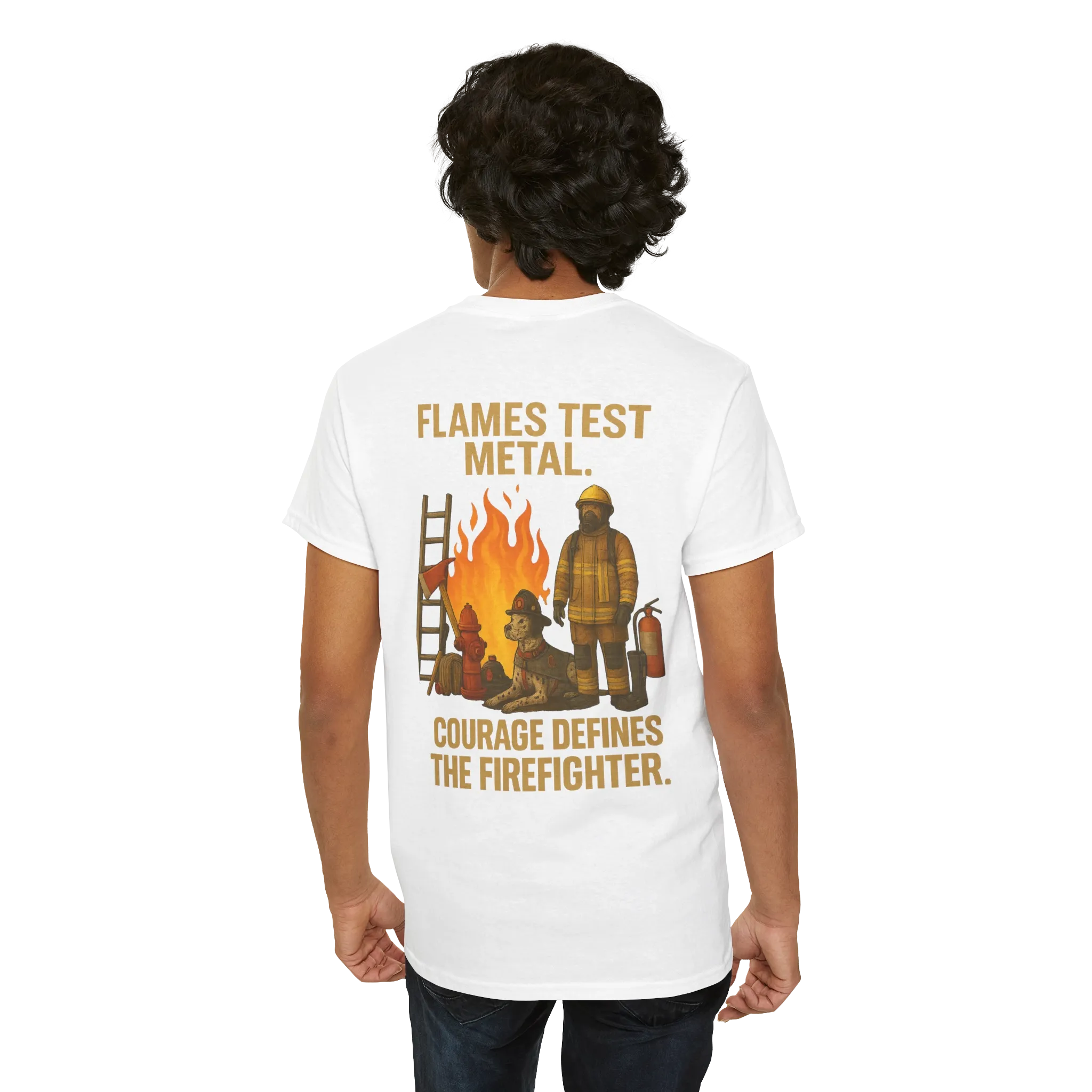 The message reads: “Flames Test Metal. Courage Defines the Firefighter.”
