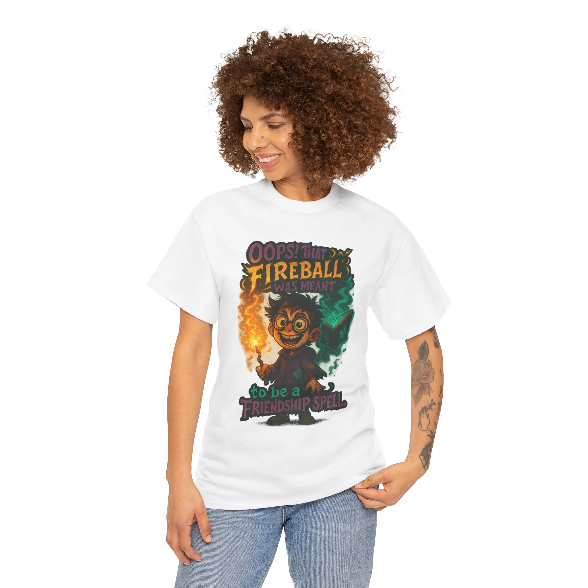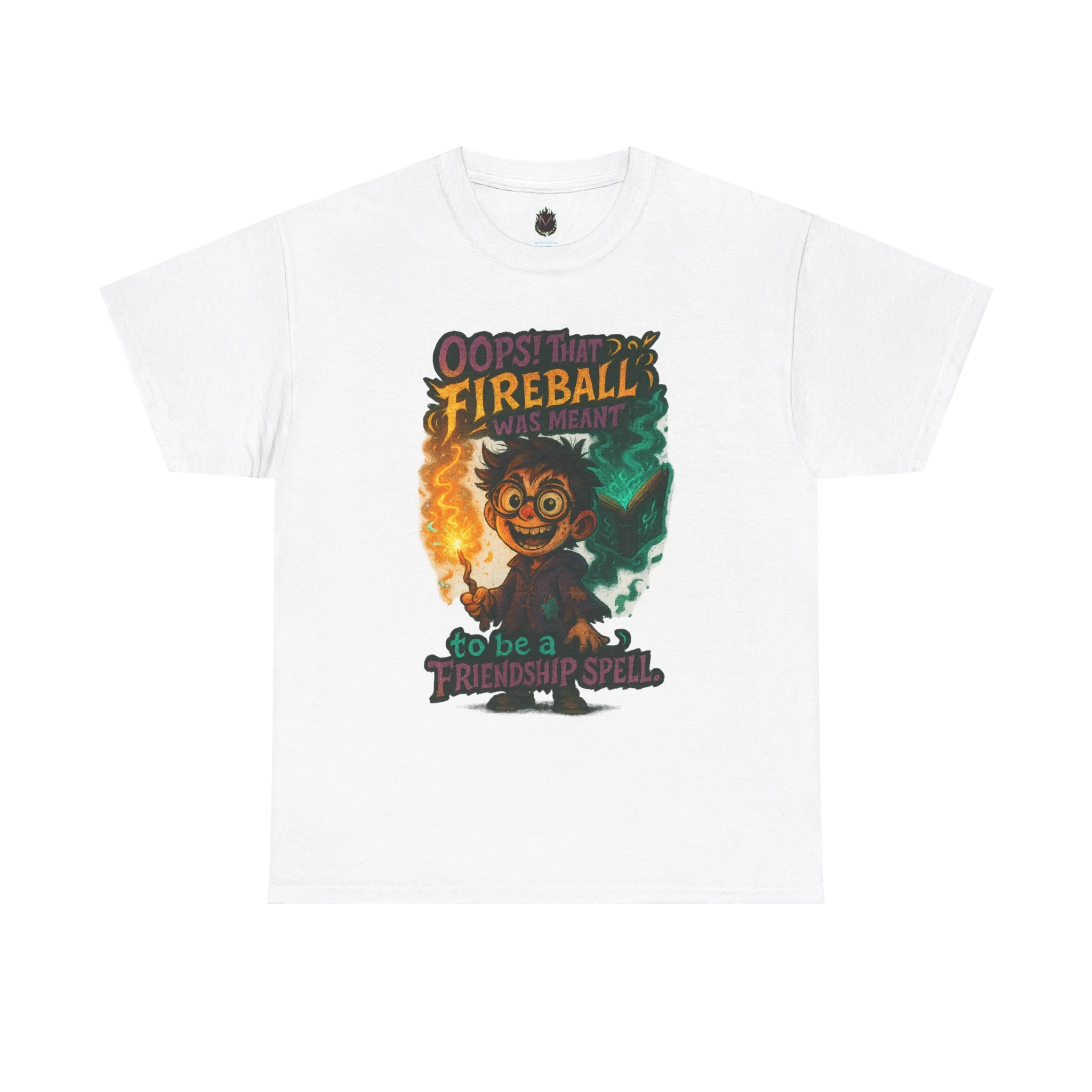 This design features an overly enthusiastic spellcaster mid-mistake, proudly paired with the phrase “Oops! That fireball was meant to be a friendship spell.”