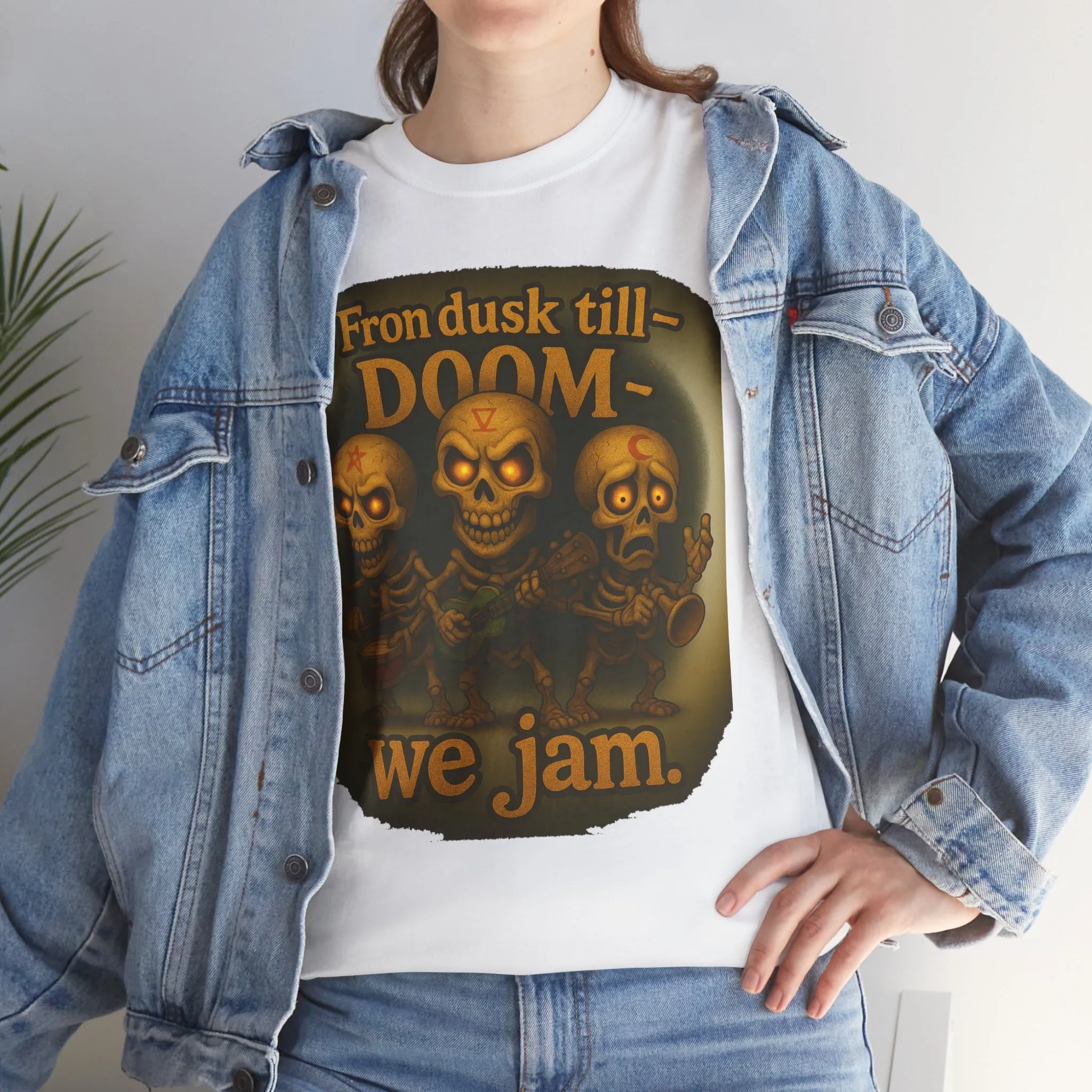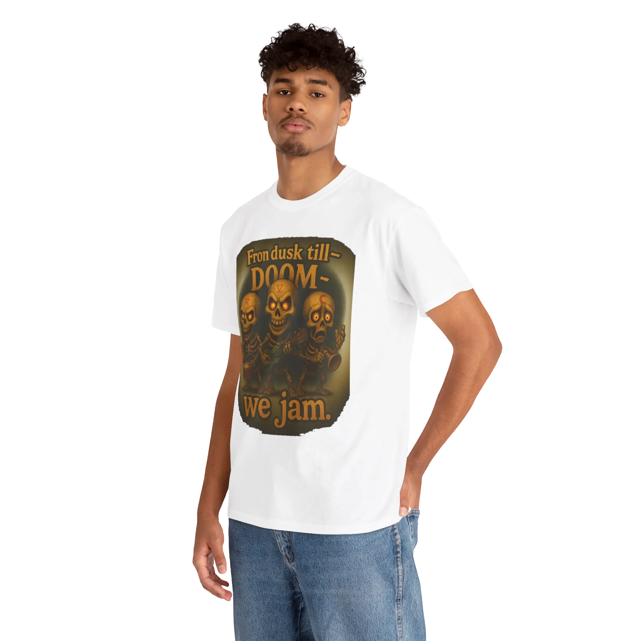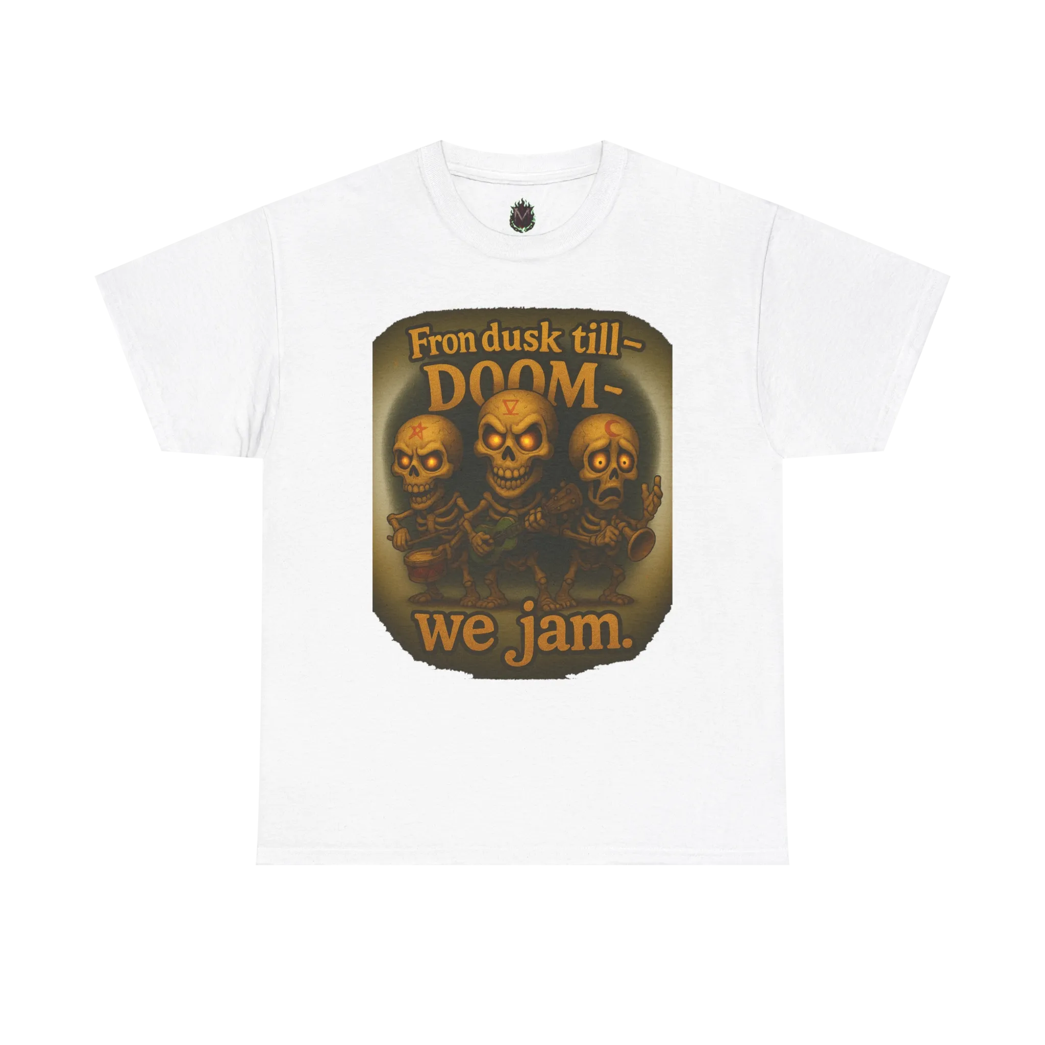 This design features a skeletal trio locked into an eternal jam session beneath the phrase “From Dusk Till Doom — We Jam.” Equal parts macabre and musical, it’s a tribute to chaos, camaraderie, and playing through the end of everything.