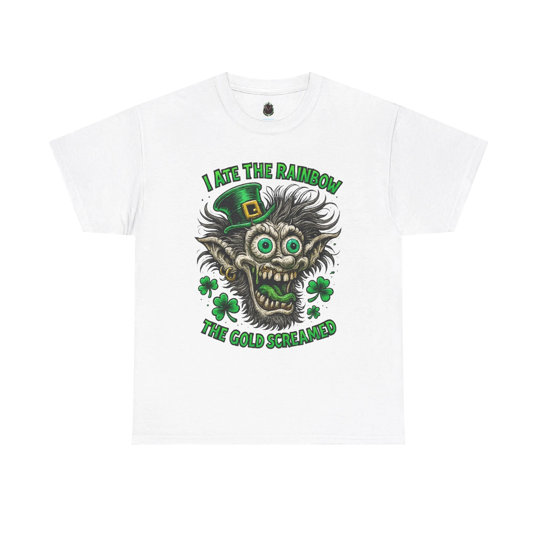 This graphic T-shirt features a manic leprechaun-inspired character paired with the phrase “I Ate the Rainbow, The Gold Screamed.”