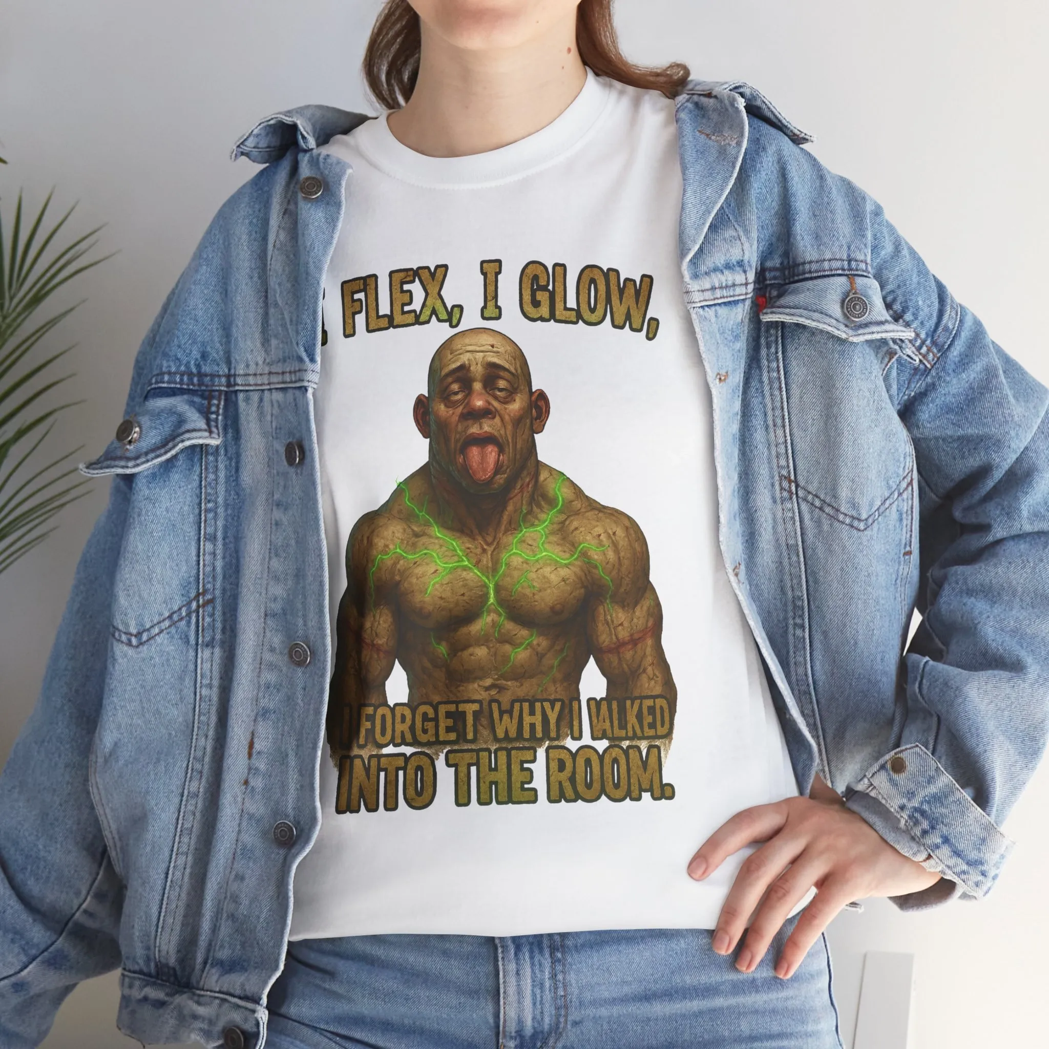 Featuring a massively built character radiating chaotic energy paired with the phrase “I Flex, I Glow, I Forget Why I Walked Into the Room,” this shirt celebrates strength, distraction, and misplaced priorities.