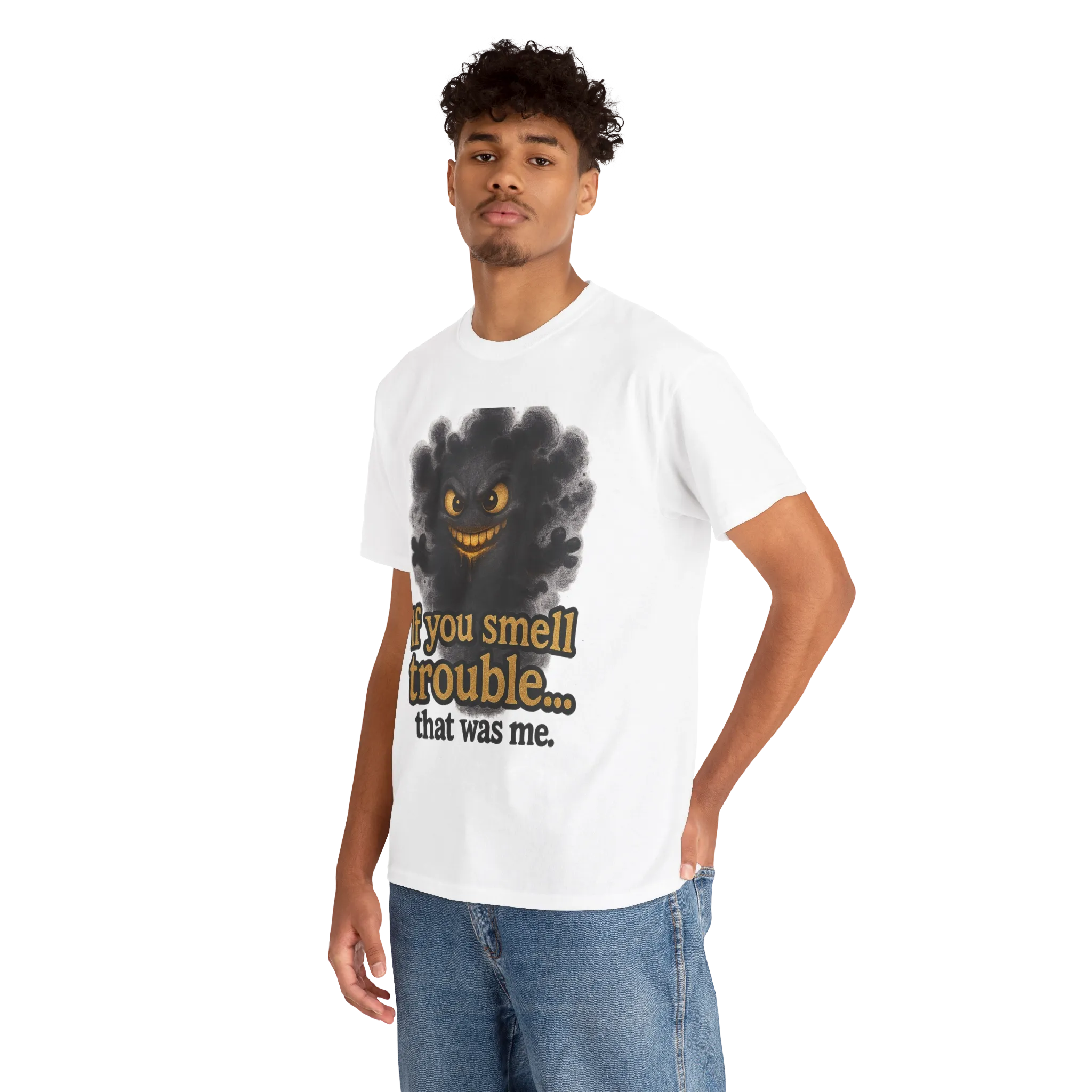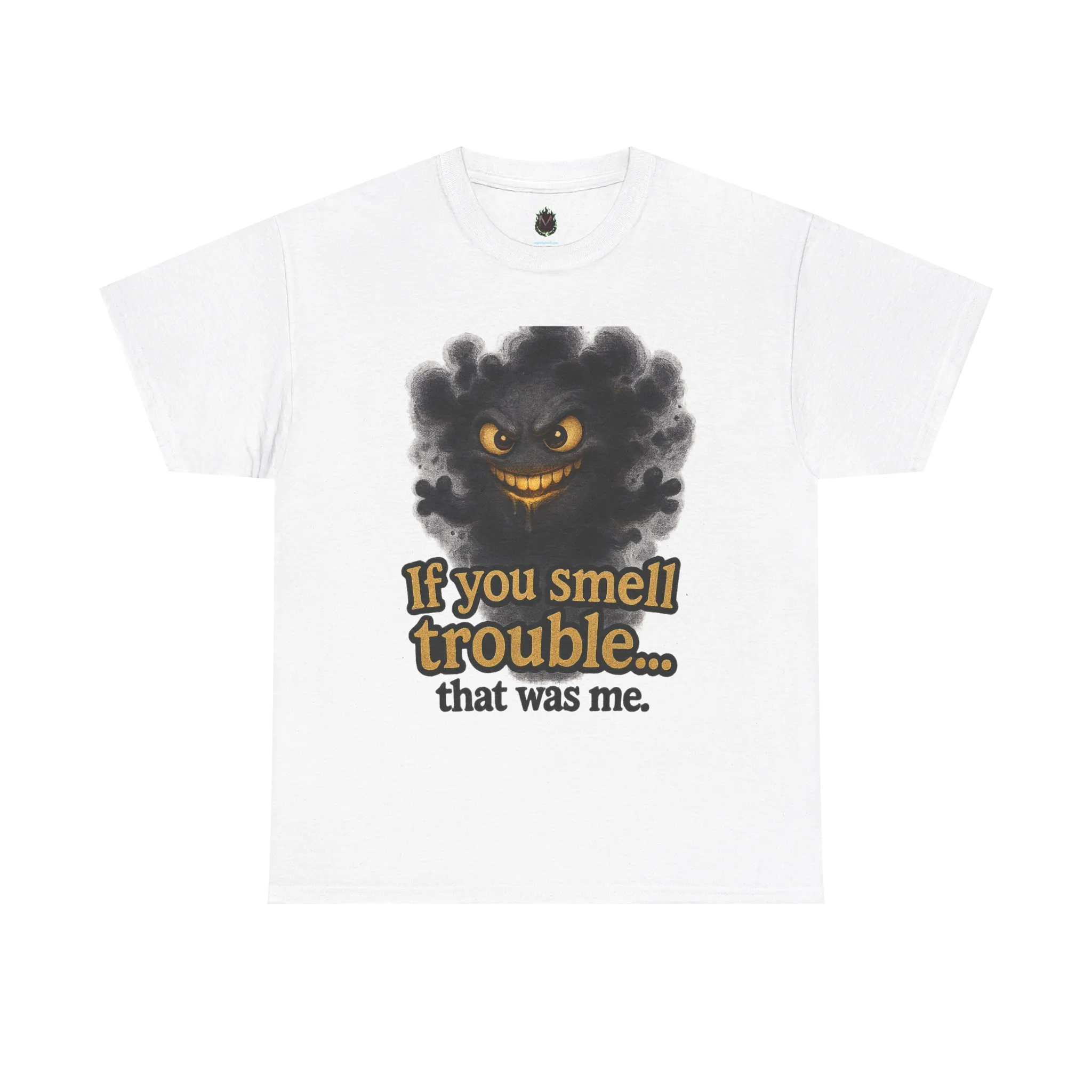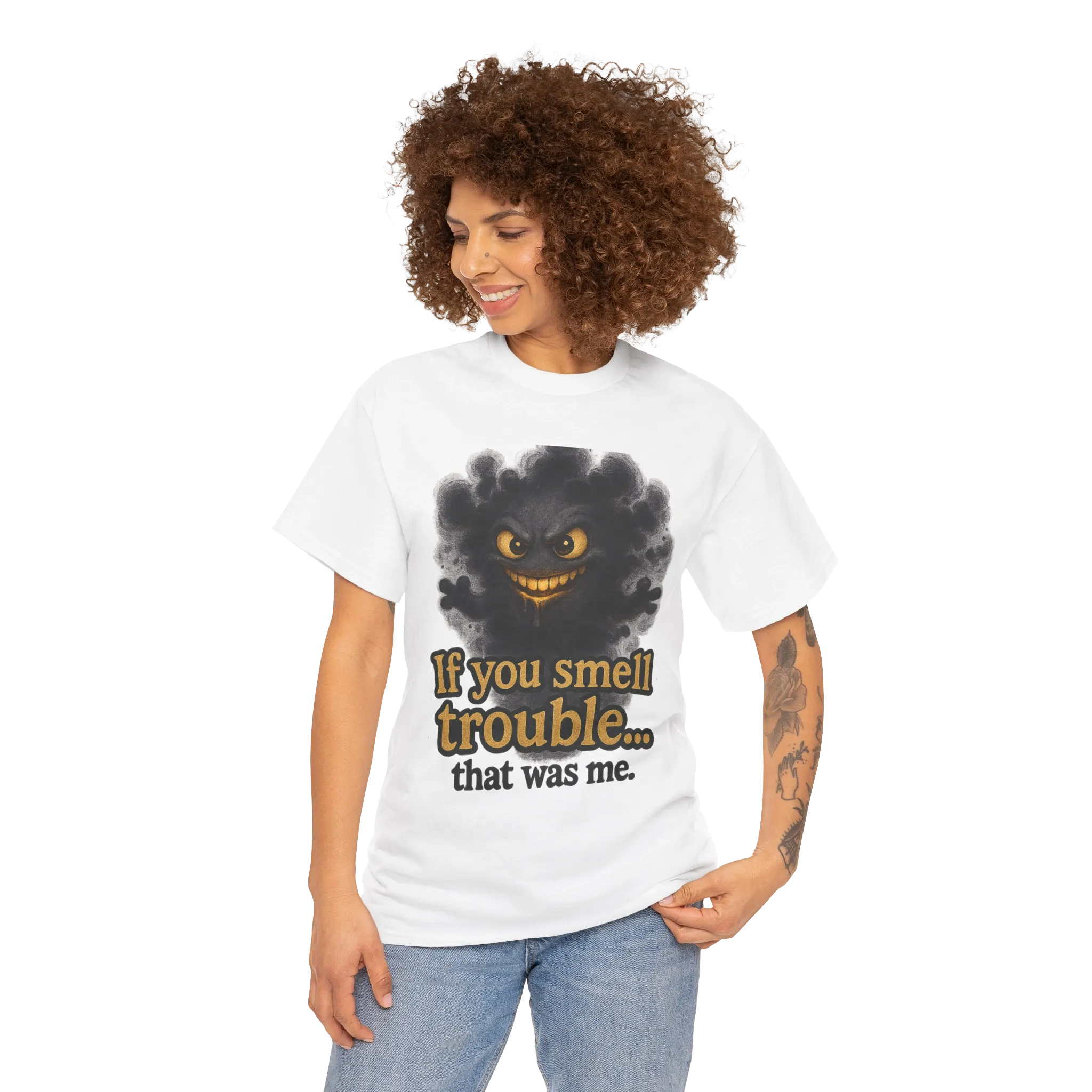Featuring a grinning cloud of chaos paired with the phrase “If you smell trouble… that was me.”, this shirt delivers mischievous energy with a darkly playful edge.