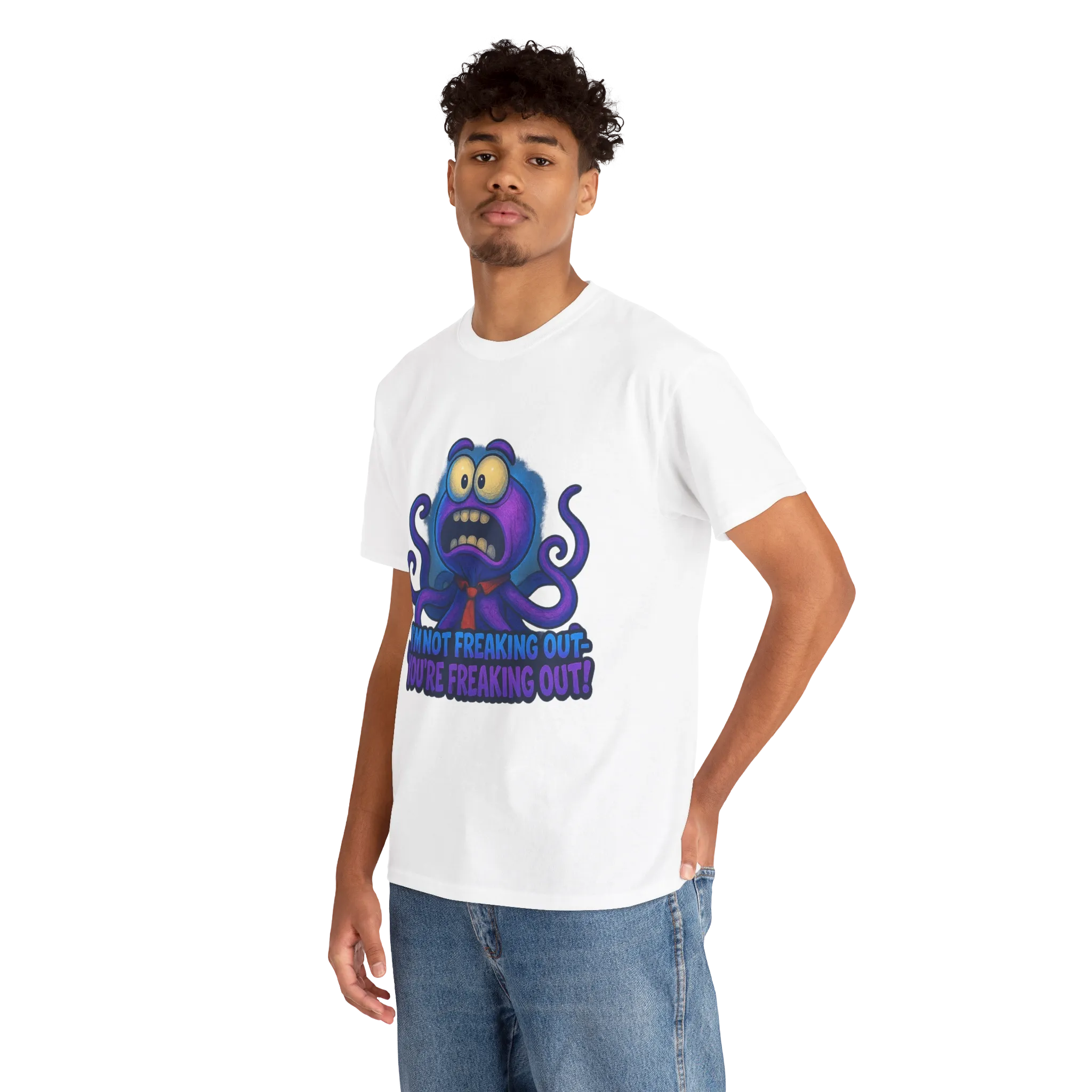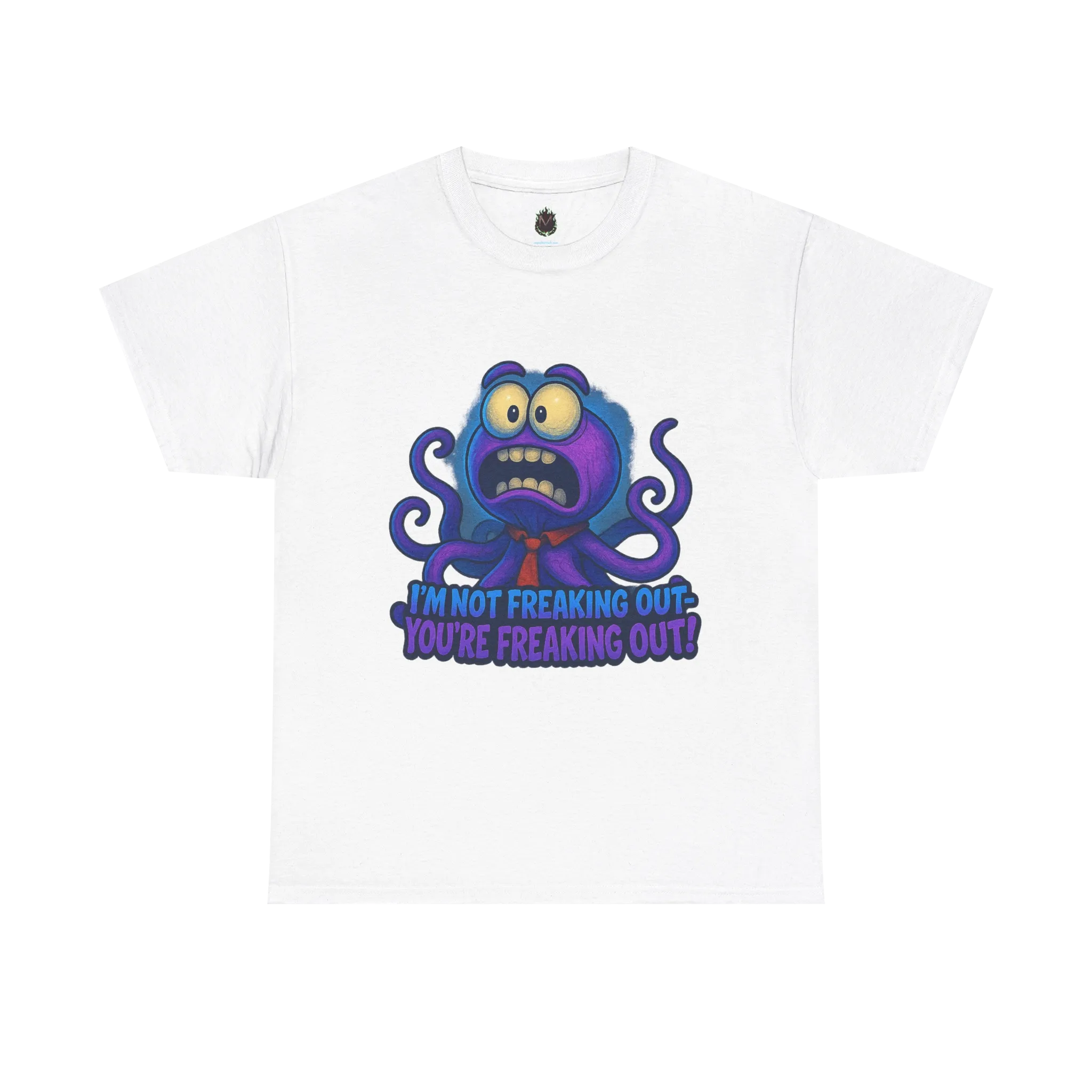 Featuring a wide-eyed, panicked creature paired with the phrase “I’m Not Freaking Out — You’re Freaking Out!”, this design leans hard into chaotic denial and anxious humor.