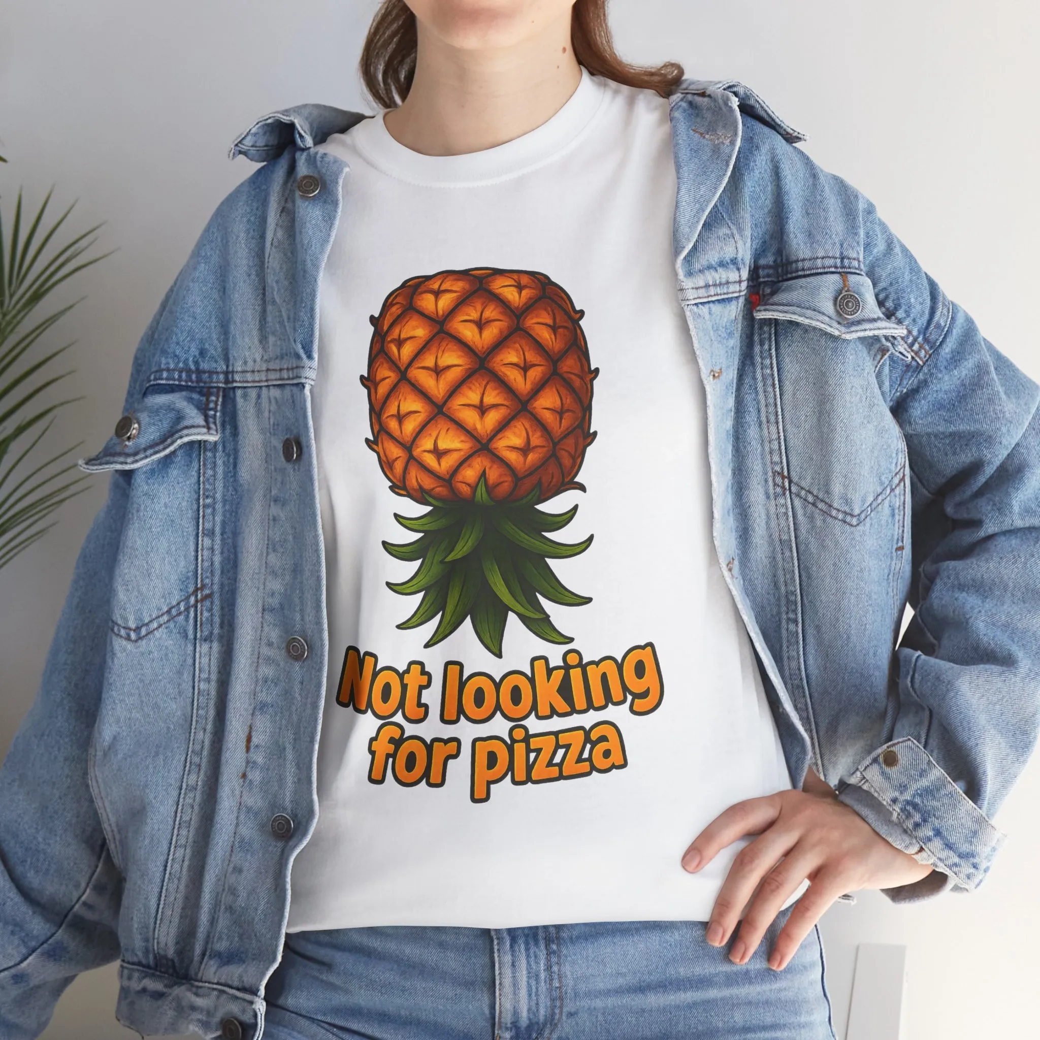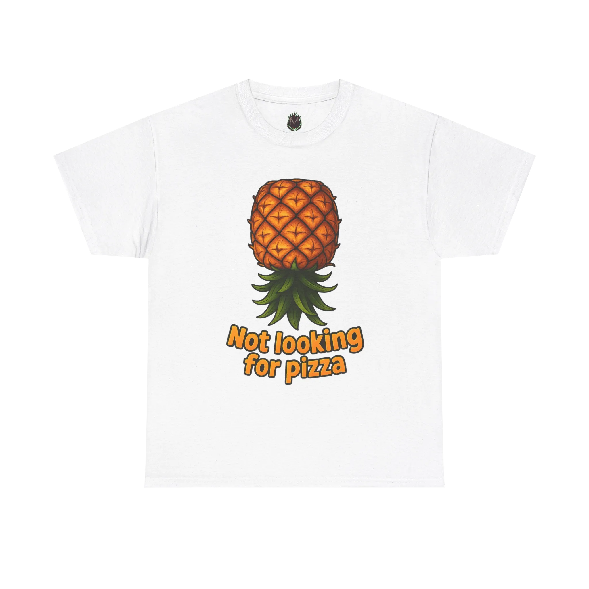 This design features a single pineapple paired with the phrase “Not looking for pizza”. No context provided. No explanation offered. If you know, you know. If you don’t, that’s fine too.