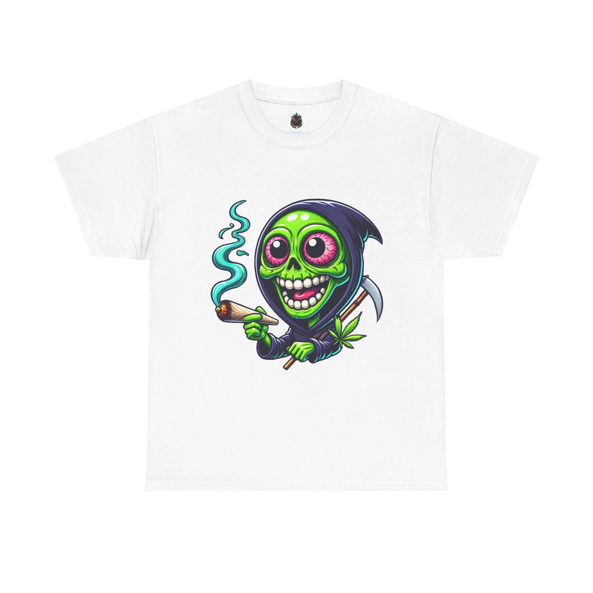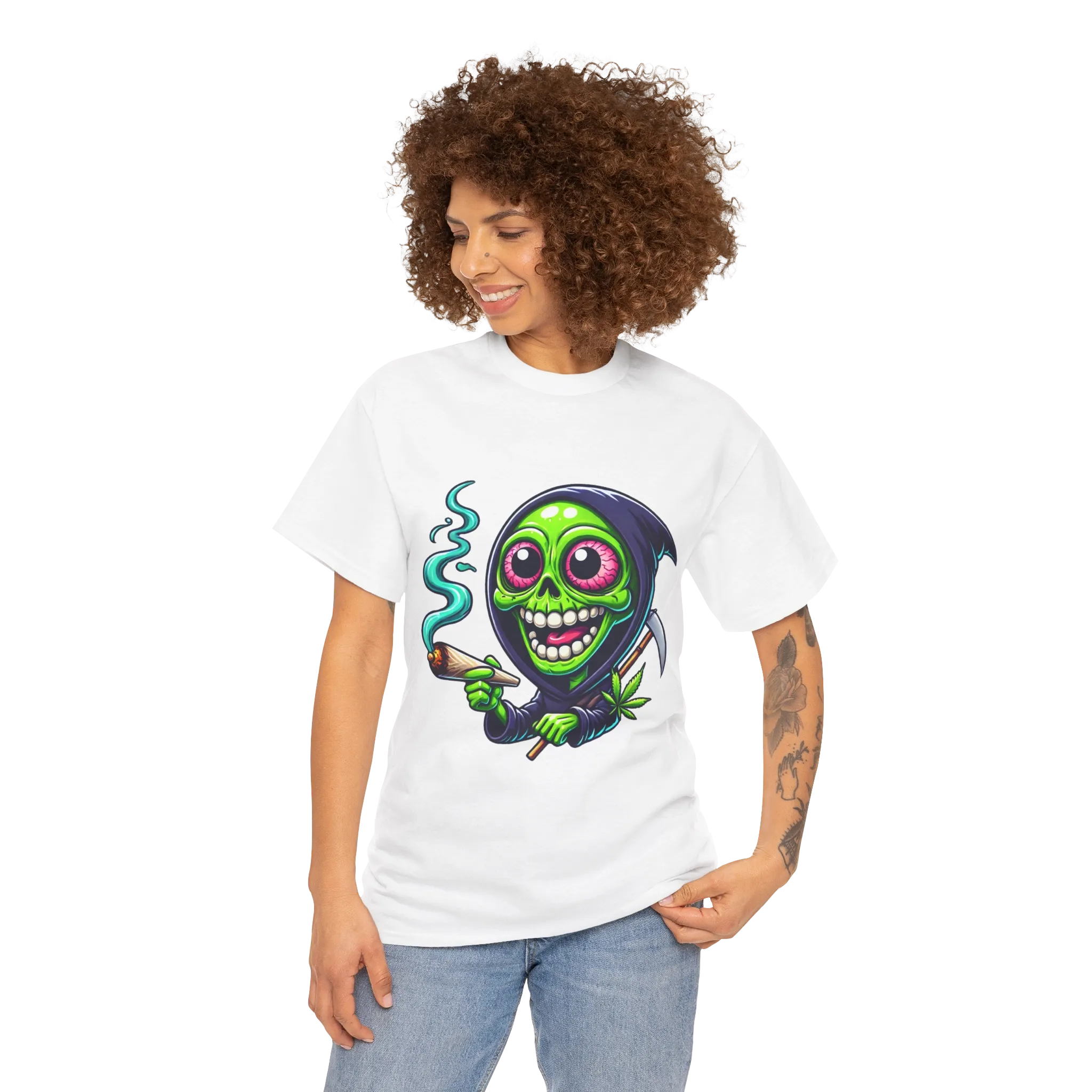 Meet the happiest grim reaper you’ve ever seen — wide-eyed, baked out of his skull, and puffing on a joint like he’s got all eternity to relax. With his trusty scythe slung across his back and a big goofy smile, this high little harvester of souls is ready to spread peace, not panic.