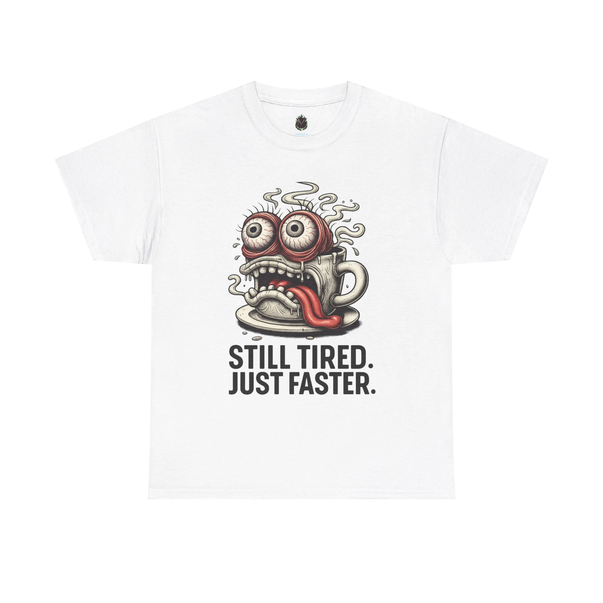 When caffeine doesn’t fix the exhaustion—it just helps you hustle through it quicker. This tee captures that chaotic clarity with a crazed coffee cup, wide eyes, twitchy energy, and a truth bomb in bold: “Still Tired. Just Faster.” Perfect for survivors of the daily grind, students, night shifters, and anyone who’s running on fumes and espresso.