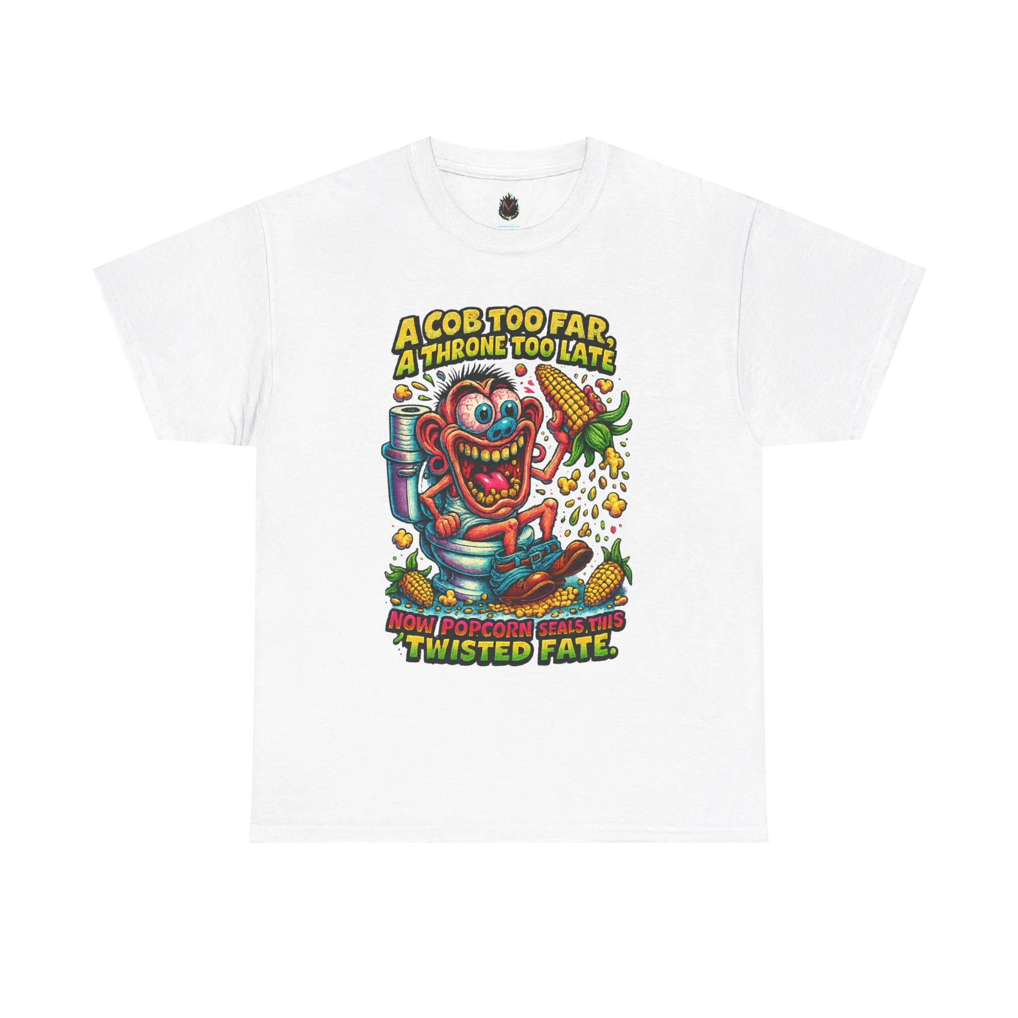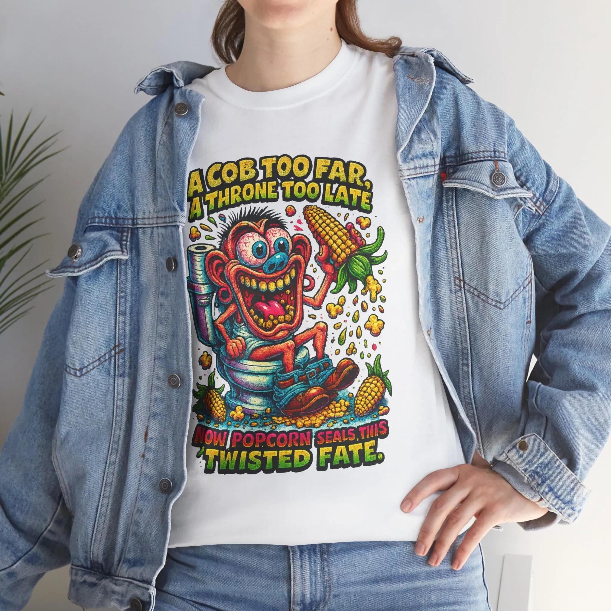 Featuring chaotic cartoon artwork and the phrase “A cob too far, a throne too late. Now popcorn seals this twisted fate.”, this design blends absurd comedy with cursed consequences.