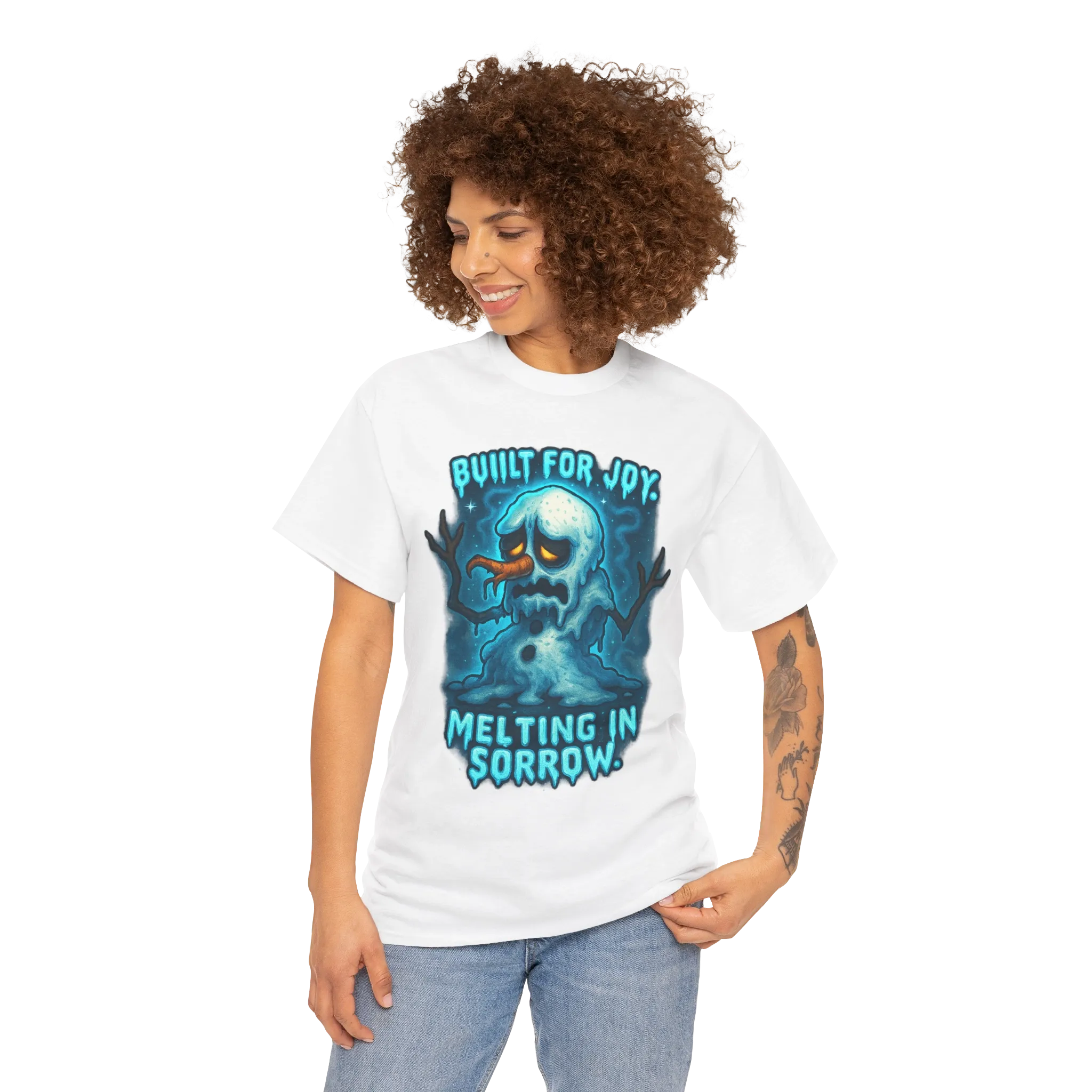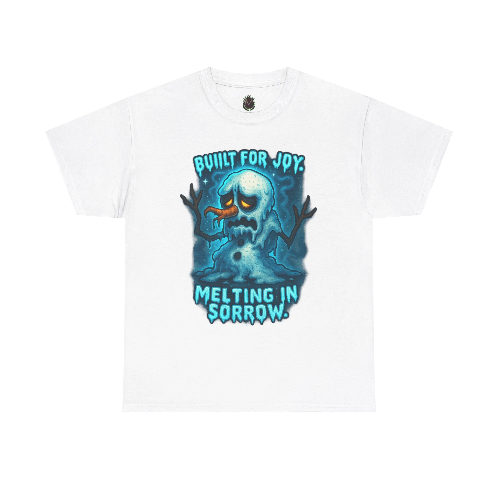 This design features a melting snowman with a hollow expression beneath the phrase “Built for Joy, Melting in Sorrow.” It captures the slow unraveling of cheer into quiet despair—darkly funny, painfully relatable, and unmistakably on-brand.