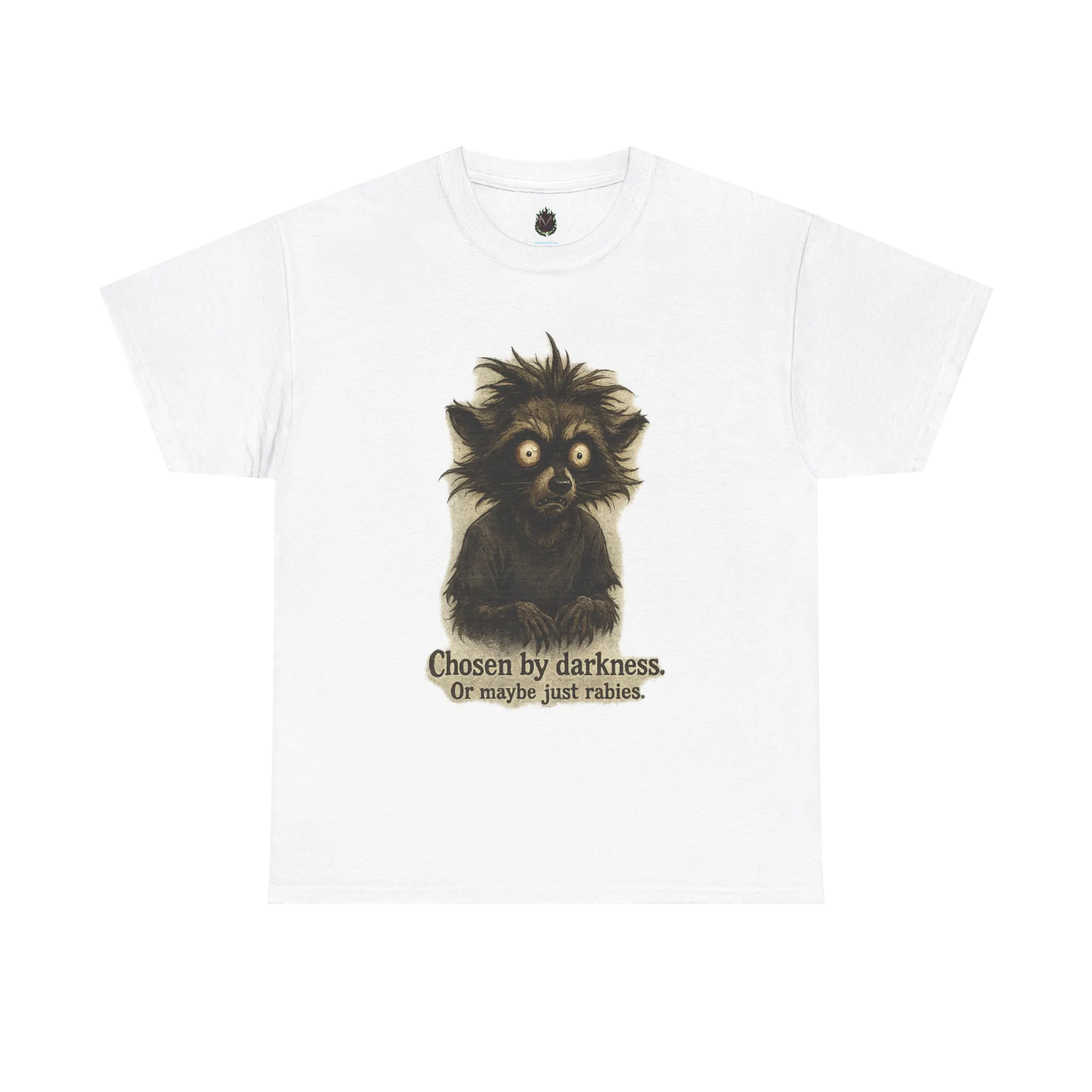 Featuring unsettling artwork and the phrase “Chosen by darkness. Or maybe just rabies.”, this design pokes fun at ominous vibes, misunderstood transformations, and the fine line between destiny and poor circumstances.