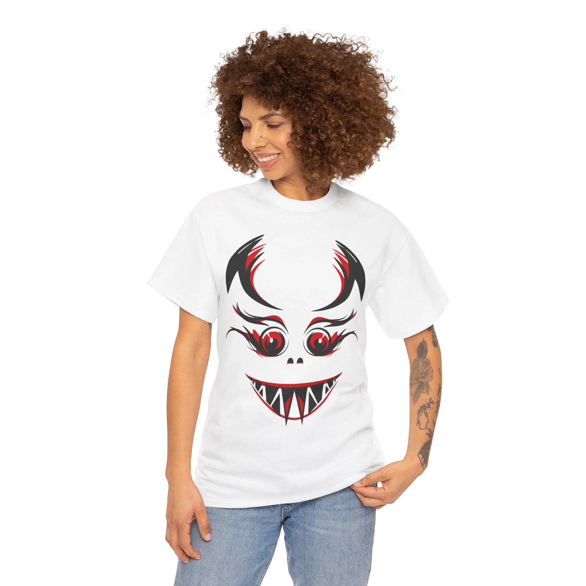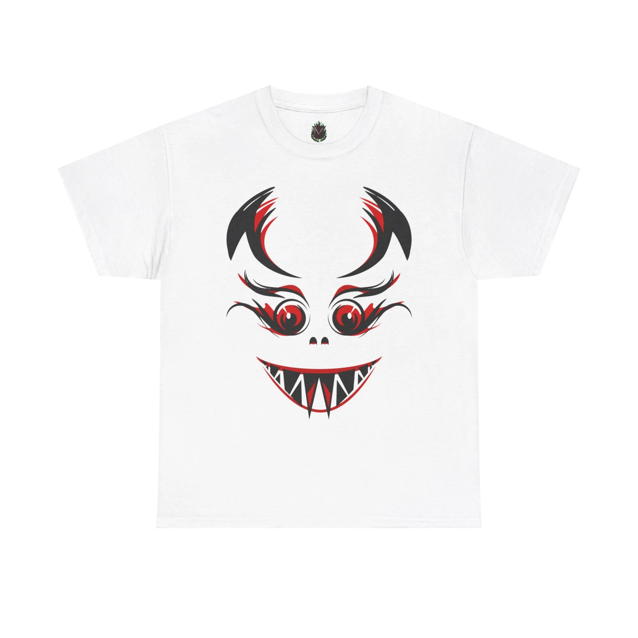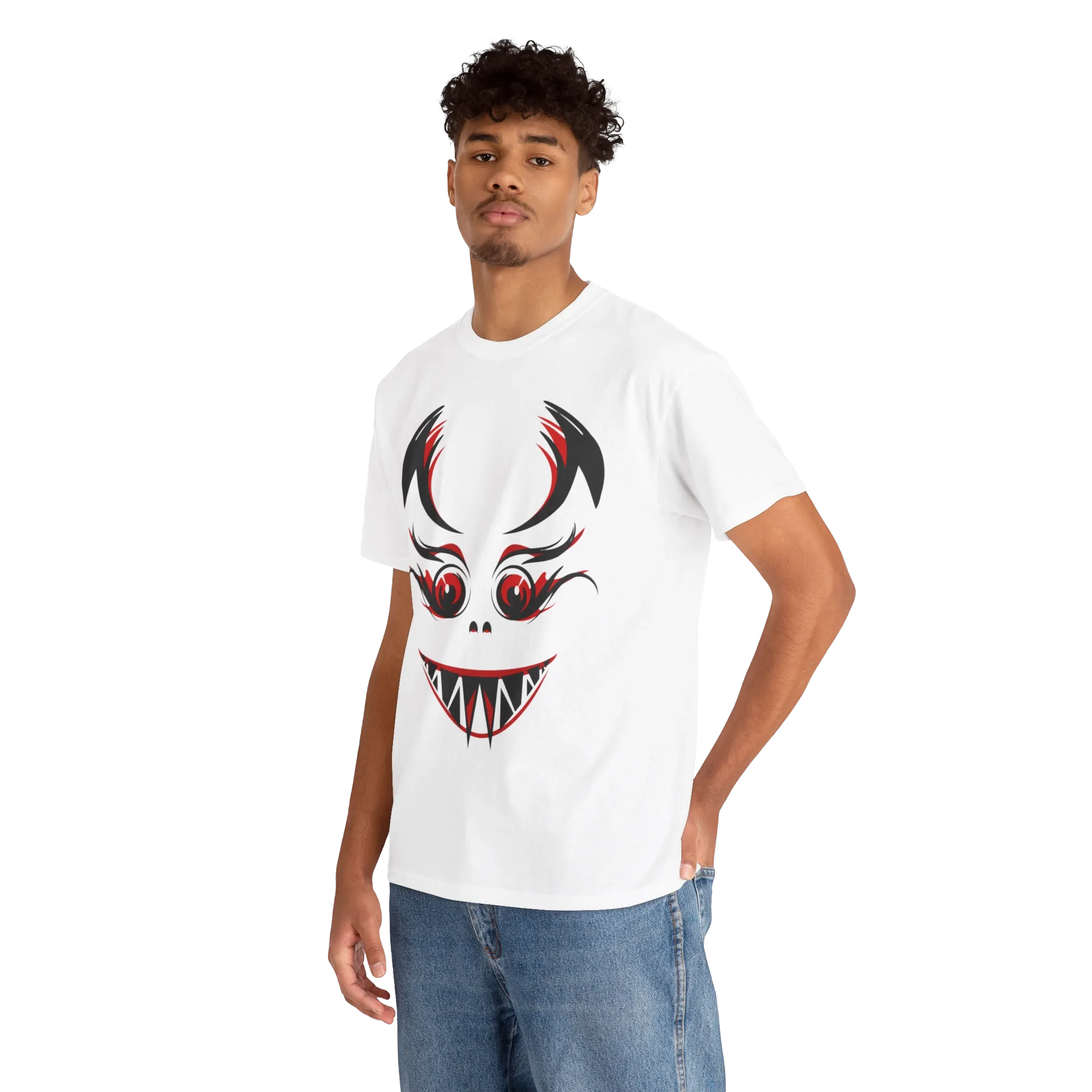This graphic T-shirt features a sharp, stylized demon face built from clean lines, exaggerated eyes, curved horns, and a jagged grin.