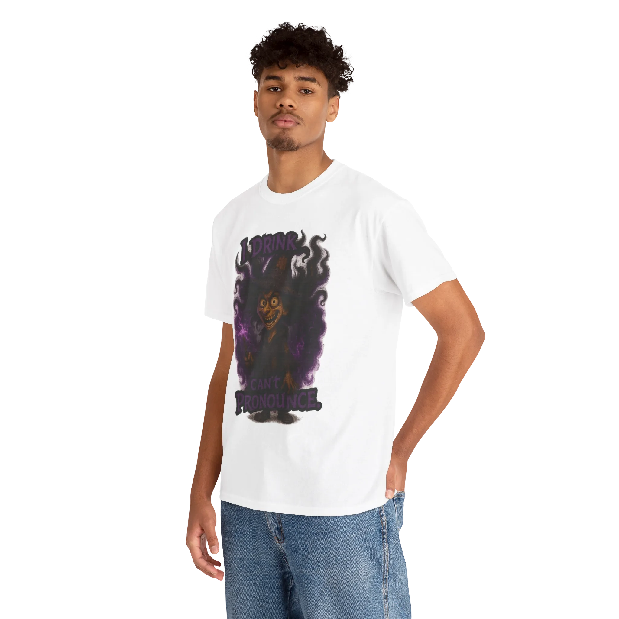 This design features a delightfully unhinged spellcaster paired with the phrase “I Drink What I Can’t Pronounce.”