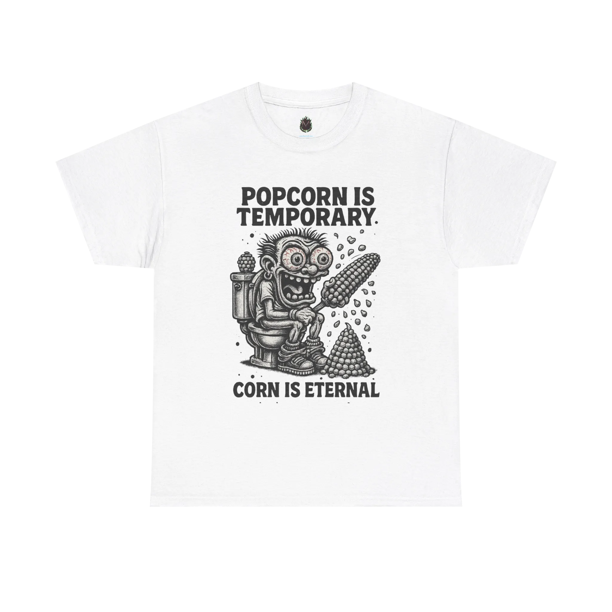 Featuring grotesque cartoon artwork and the phrase “Popcorn is temporary. Corn is eternal.”, this design blends absurd humor with cursed philosophy.