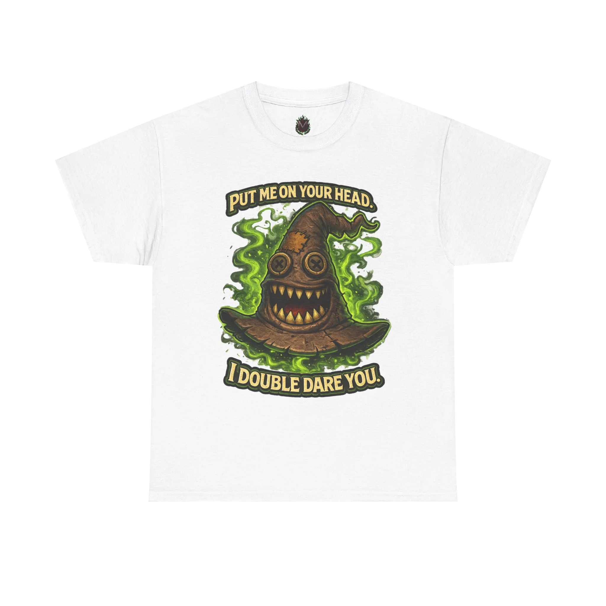 This design features a cursed, stitched witch hat radiating hostile energy alongside the phrase “Put Me on Your Head. I Double Dare You.”