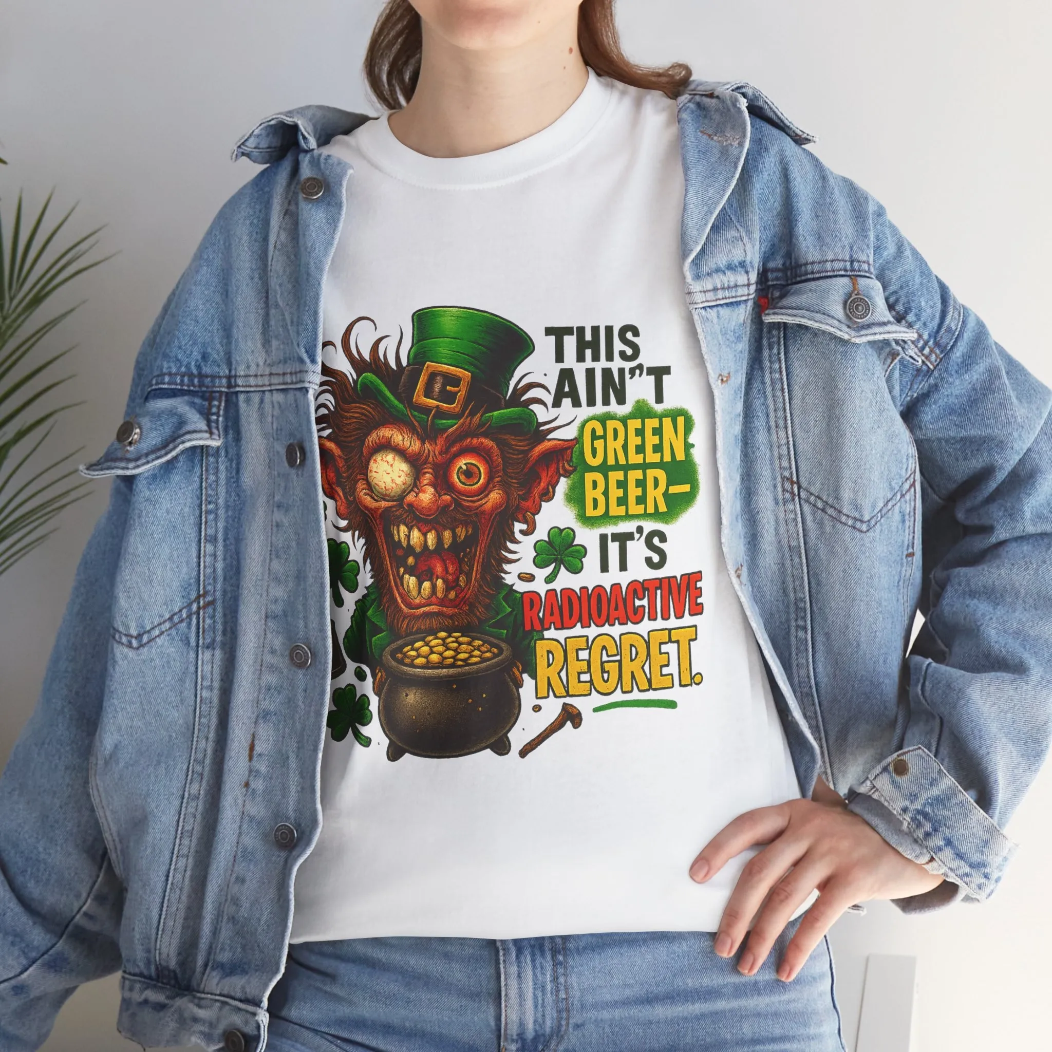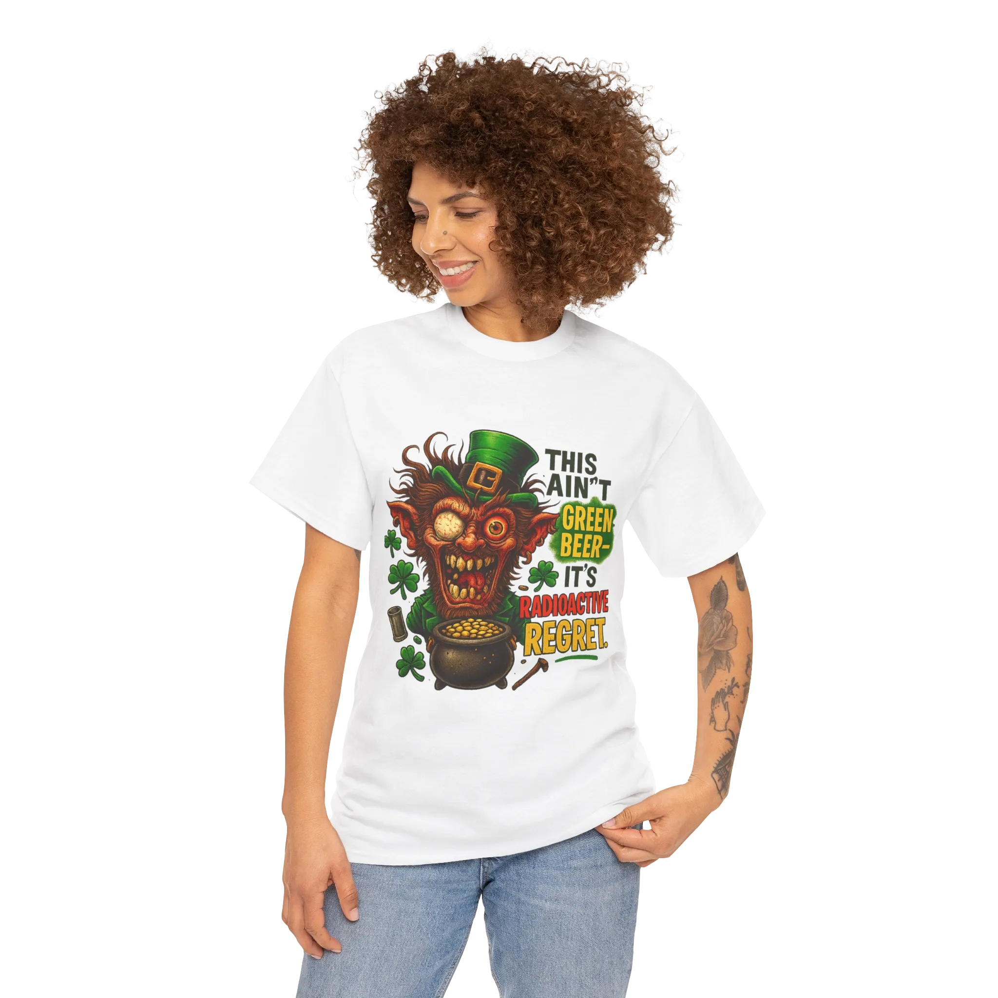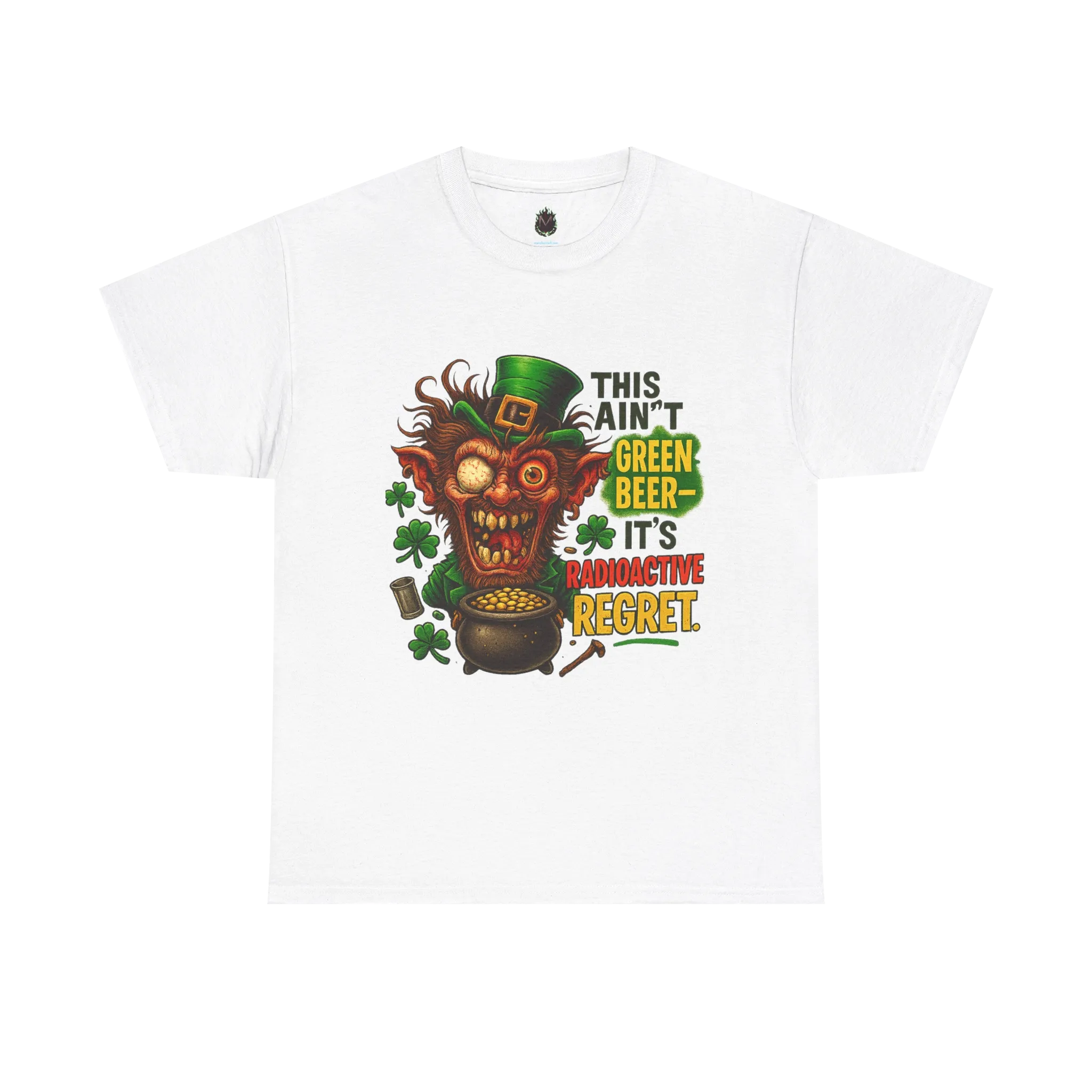 The vibrant quote “This ain’t green beer—it’s RADIOACTIVE REGRET” says everything your face couldn’t.