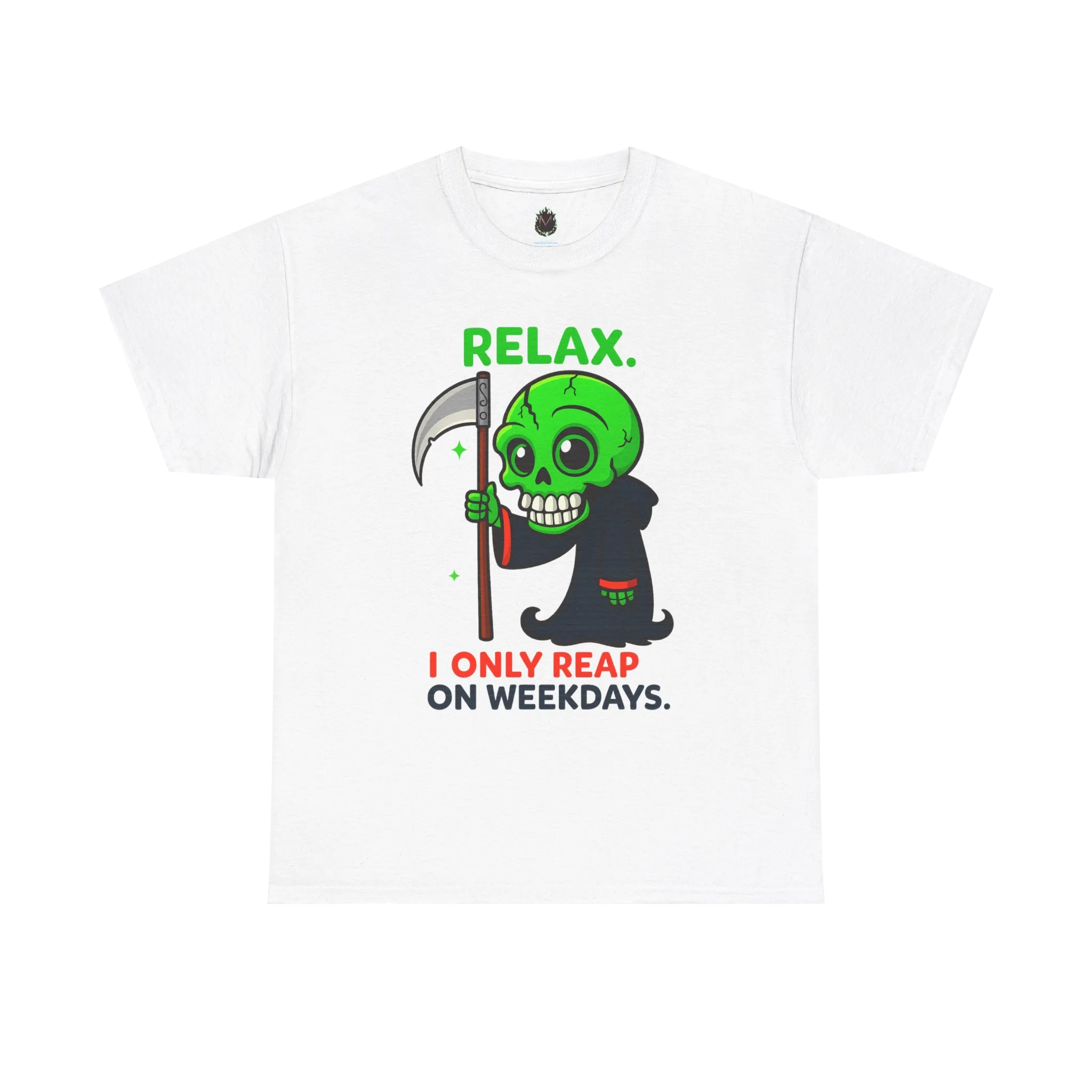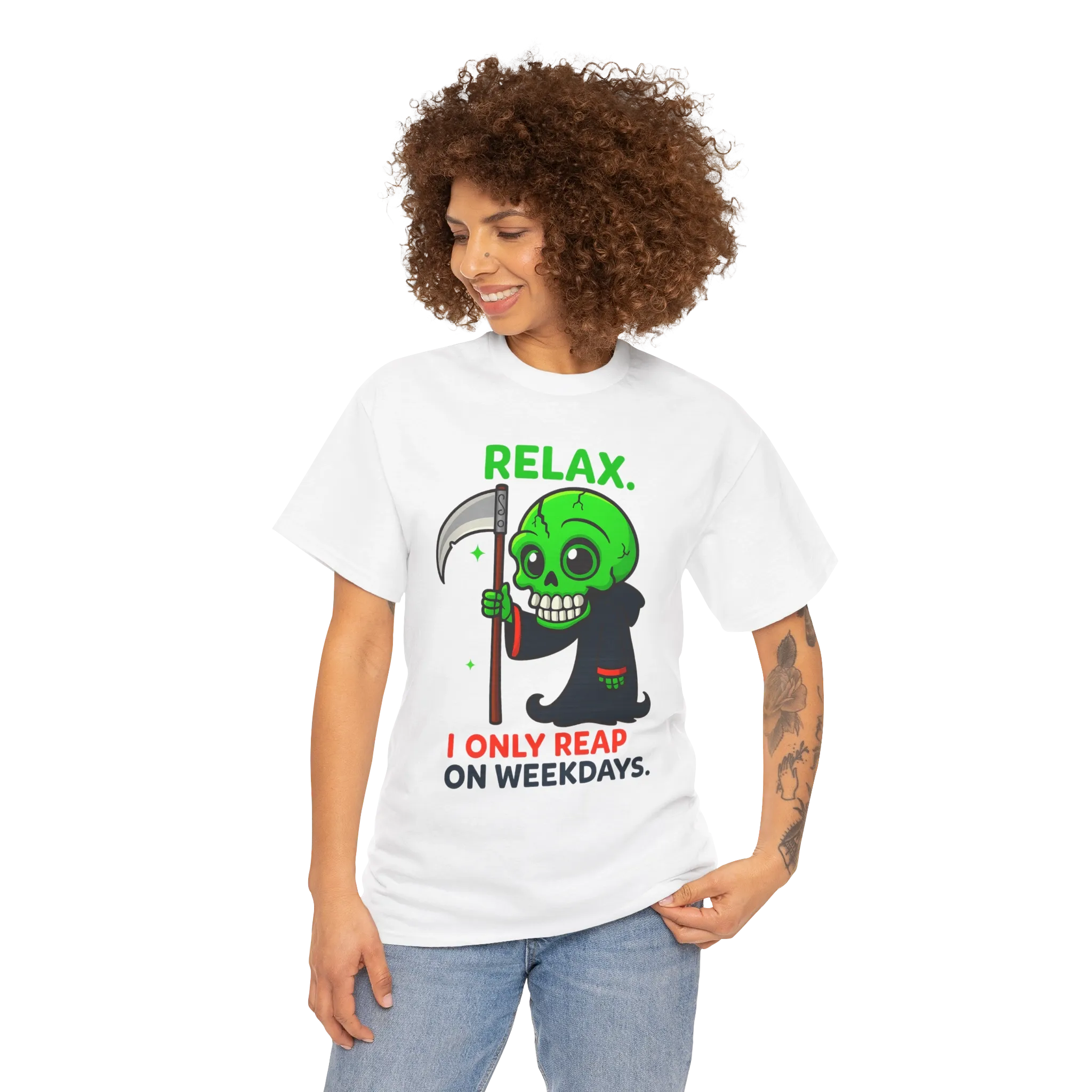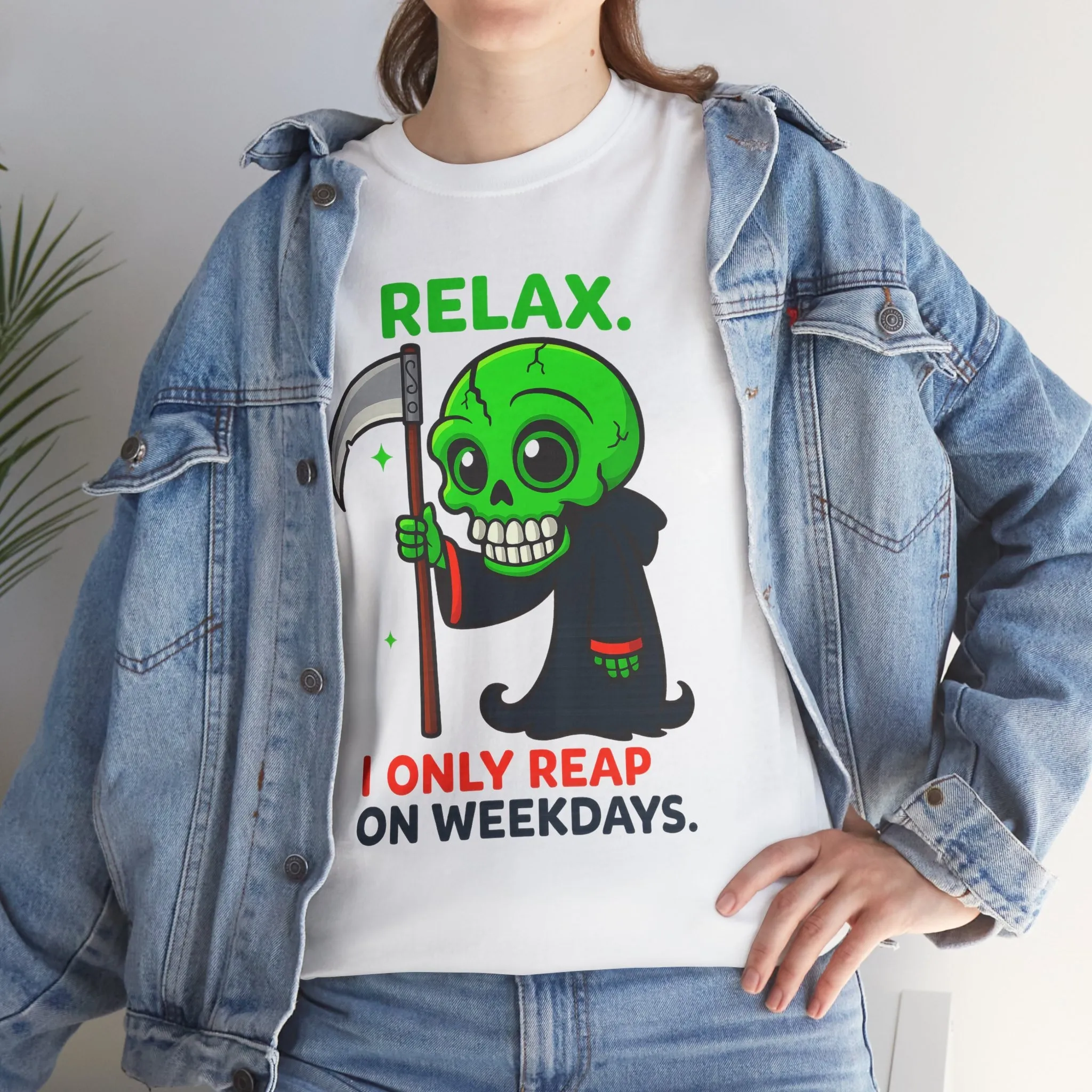 Relax, I Only Reap on Weekdays – Dark Humor Graphic T-Shirt