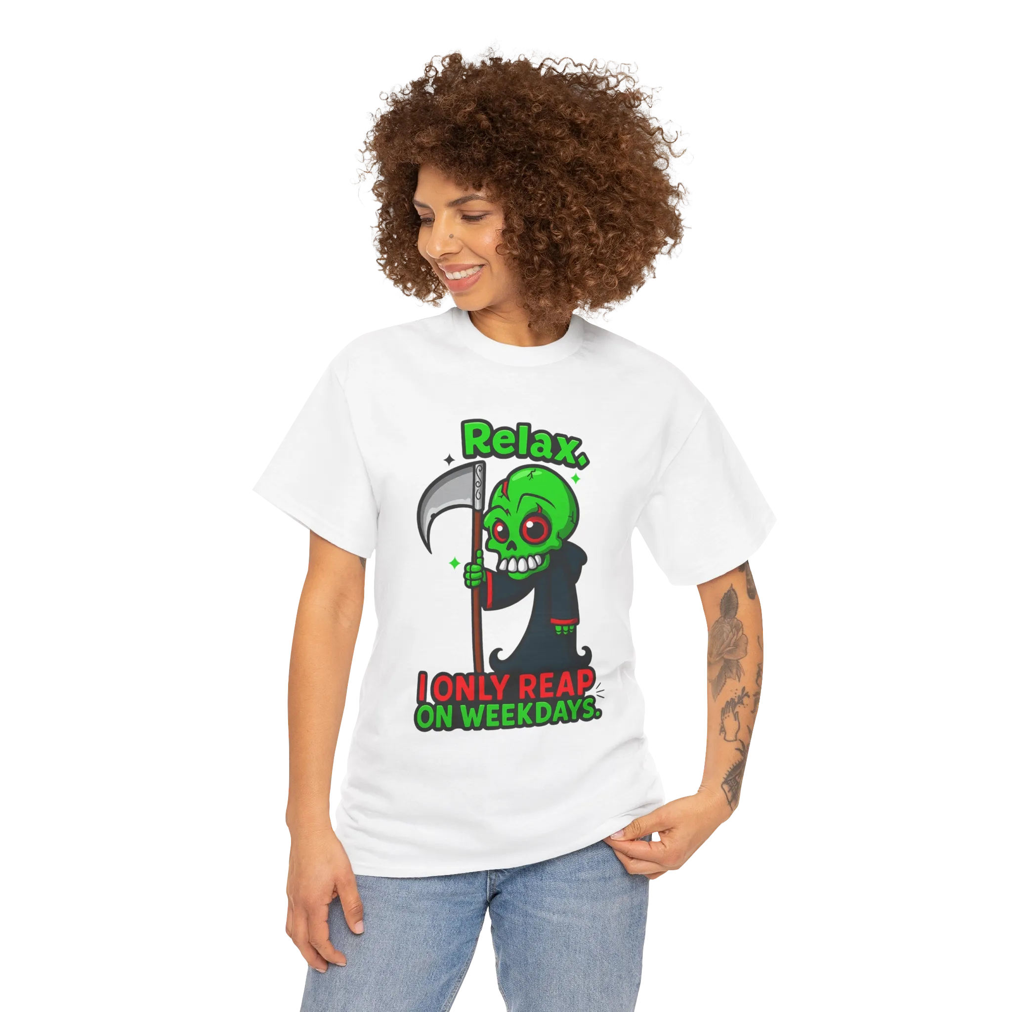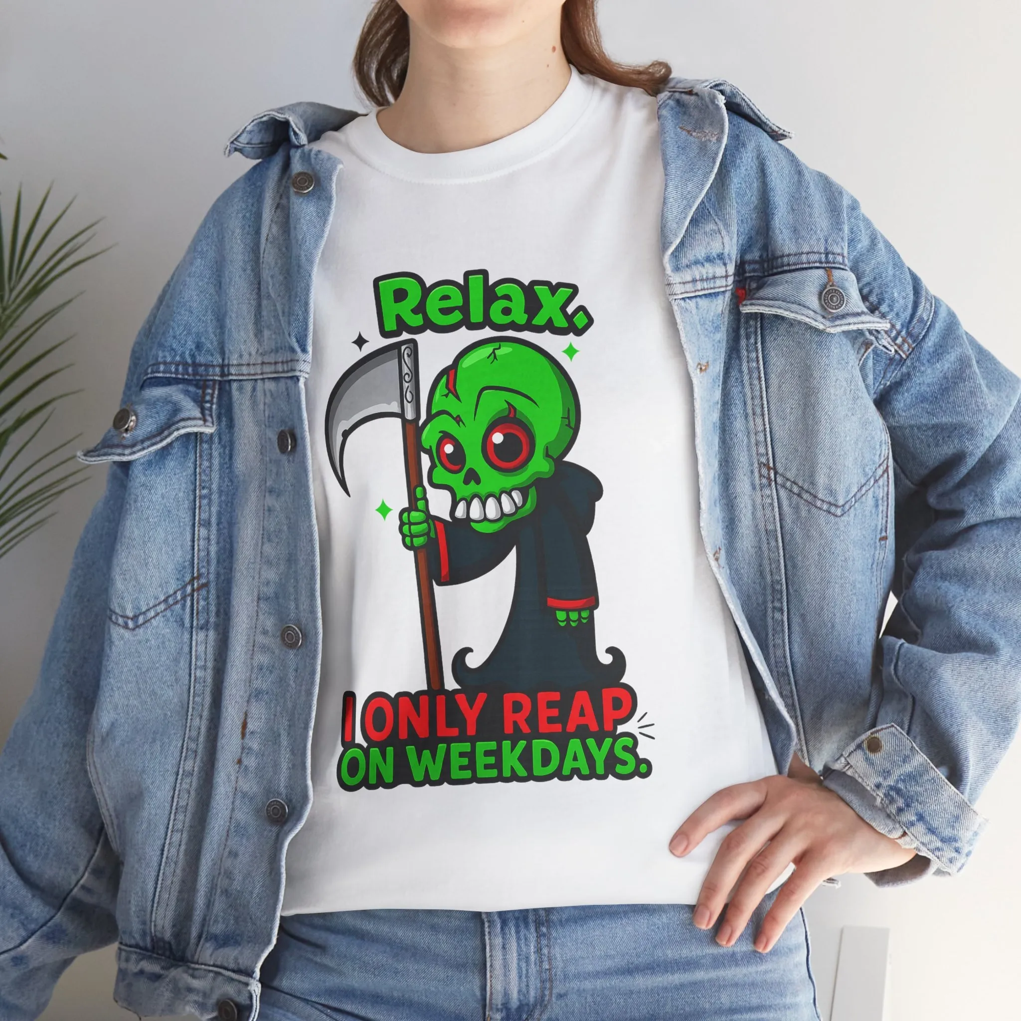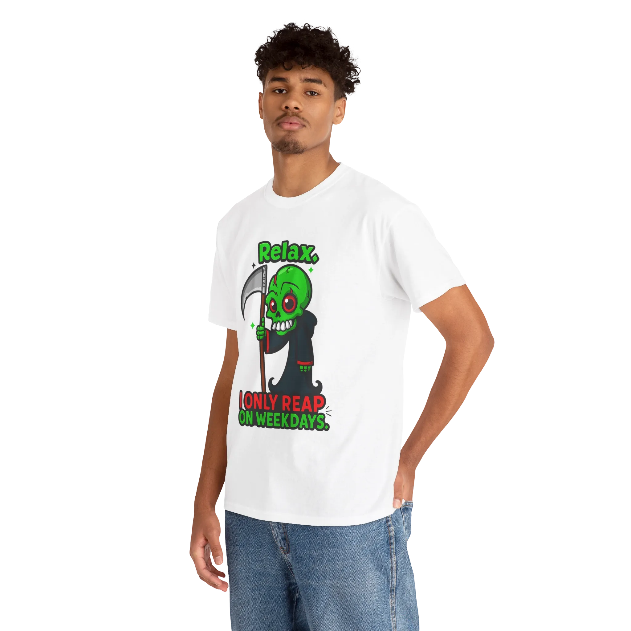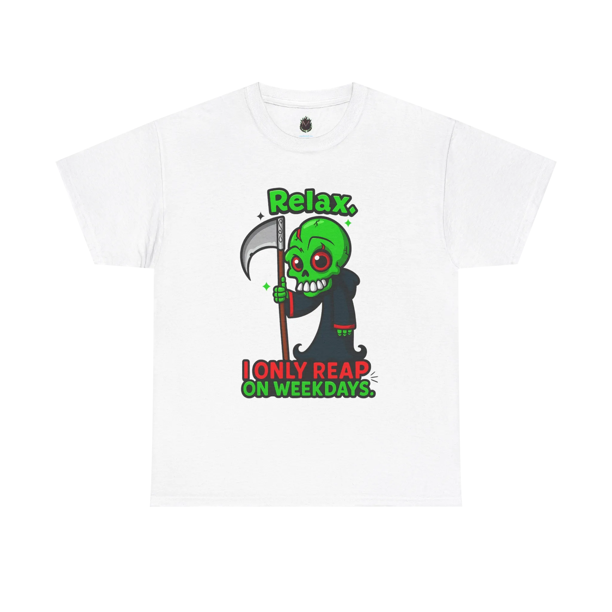 This graphic T-shirt features a cartoon grim reaper paired with the phrase “Relax. I Only Reap on Weekdays.”
