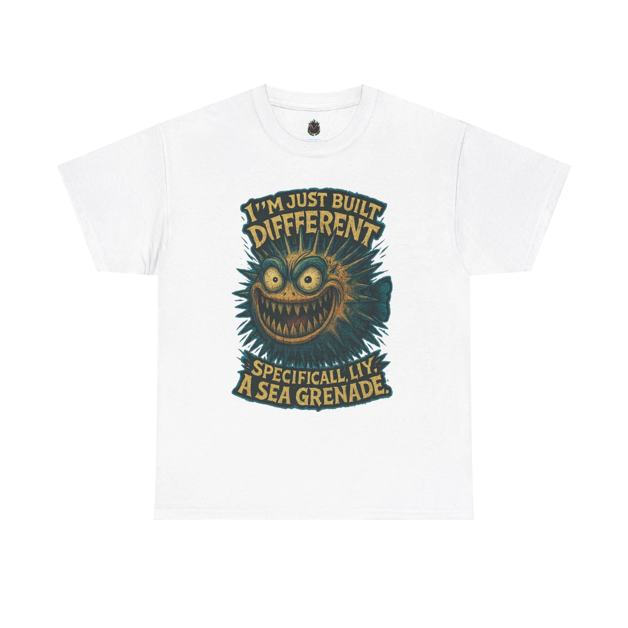 This design features a deranged, spiky sea creature paired with the phrase “I’m just built different. Specifically, like a sea grenade.” Cute at first glance, catastrophic on closer inspection.
