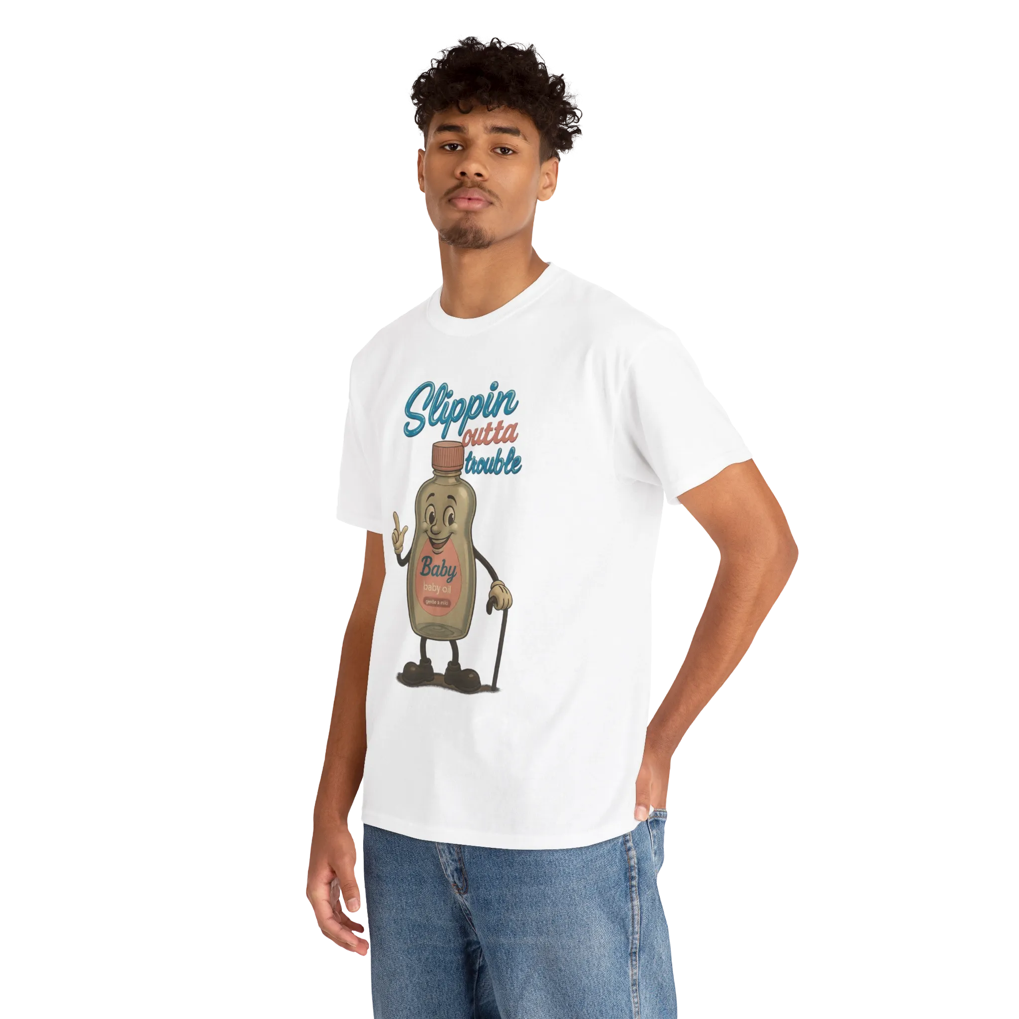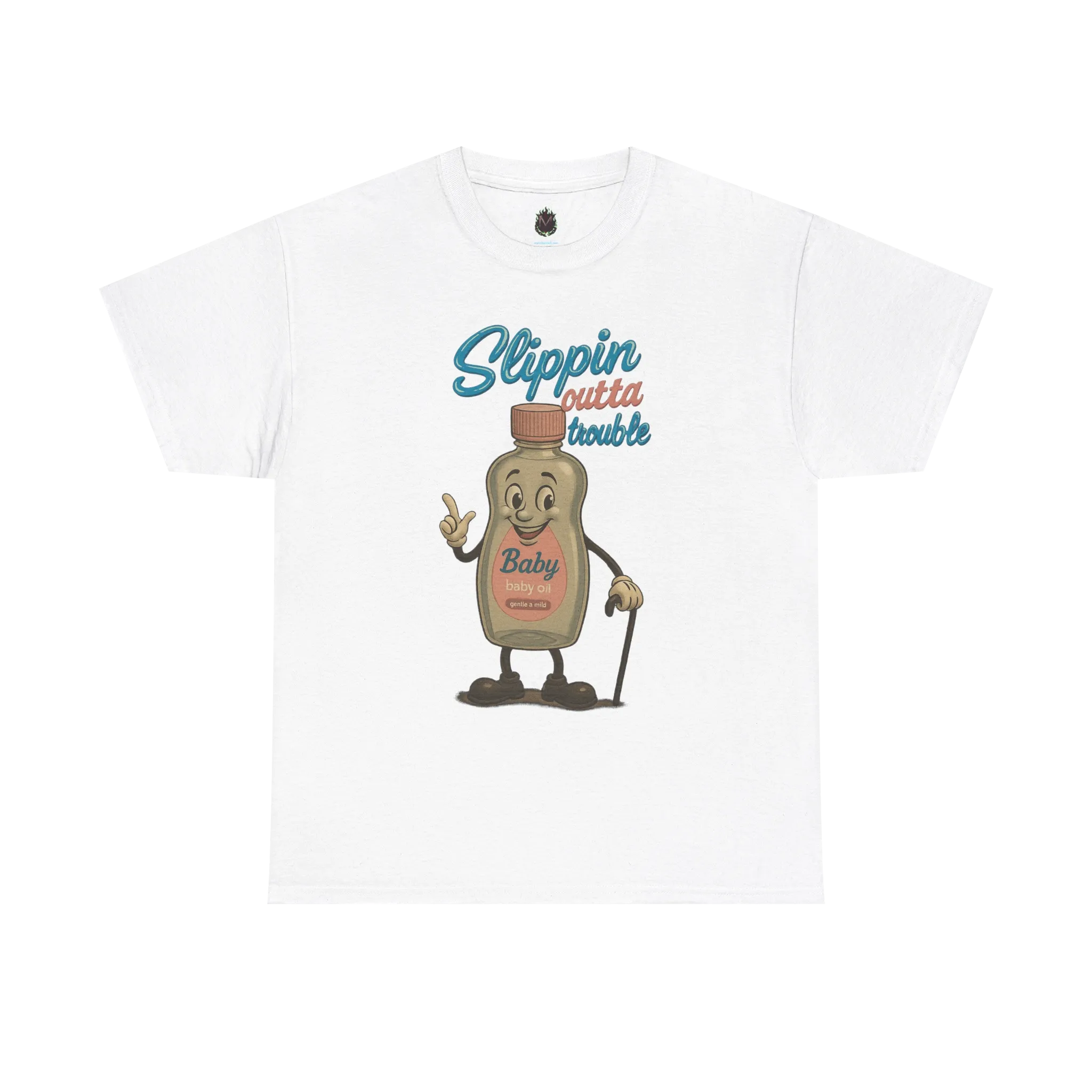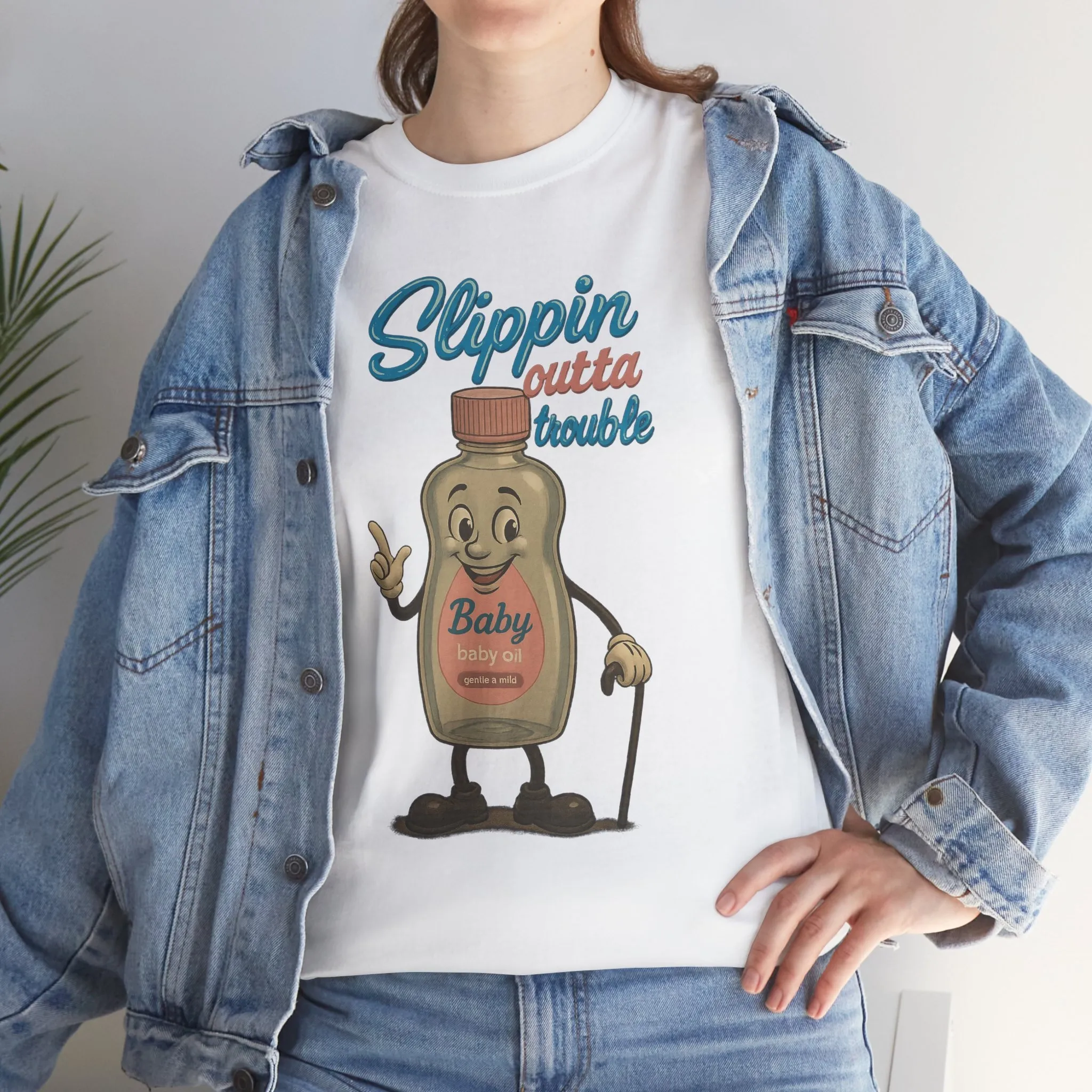 Step back in time with this quirky "Slippin' Outta Trouble" t-shirt featuring a charming cartoon baby oil bottle that's full of character.