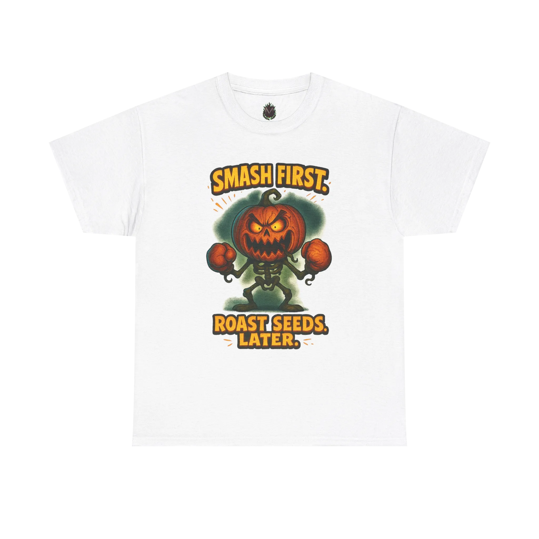 Featuring an enraged jack-o’-lantern creature mid-charge with the phrase “Smash First. Roast Seeds Later.”, this shirt captures chaotic autumn energy and unapologetic decision-making.