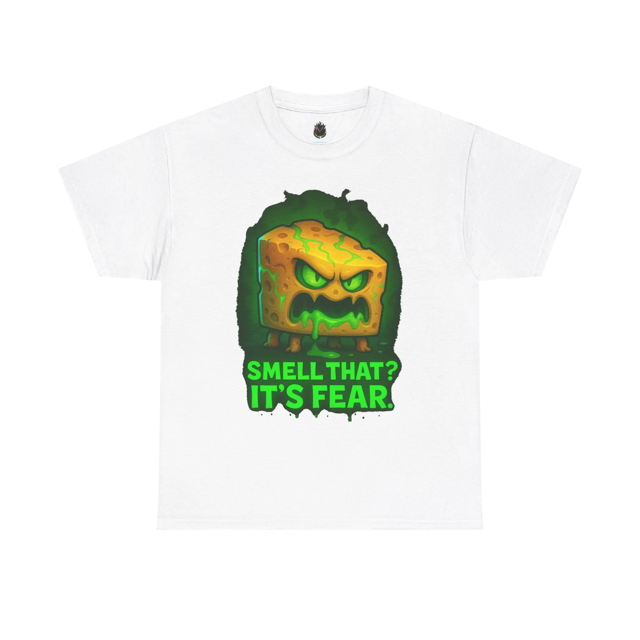 This shirt features a grotesquely angry block of toxic cheese, oozing neon-green slime and staring straight through you with pure menace. It’s equal parts absurd, unsettling, and impossible to ignore.