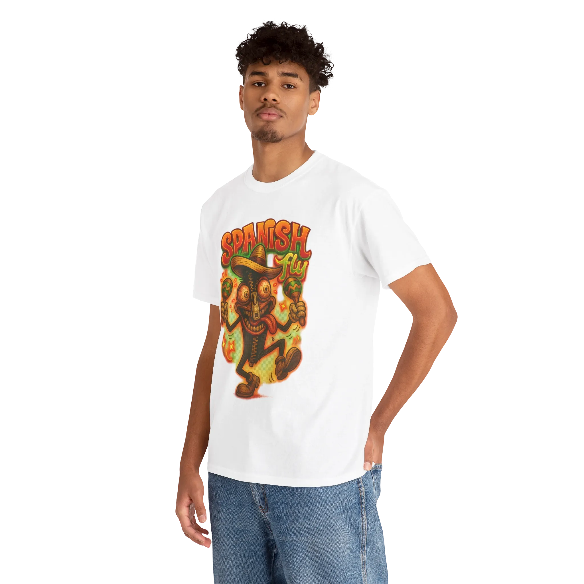 The Spanish Fly tee is a blazing blend of energy, humor, and borderline insanity.