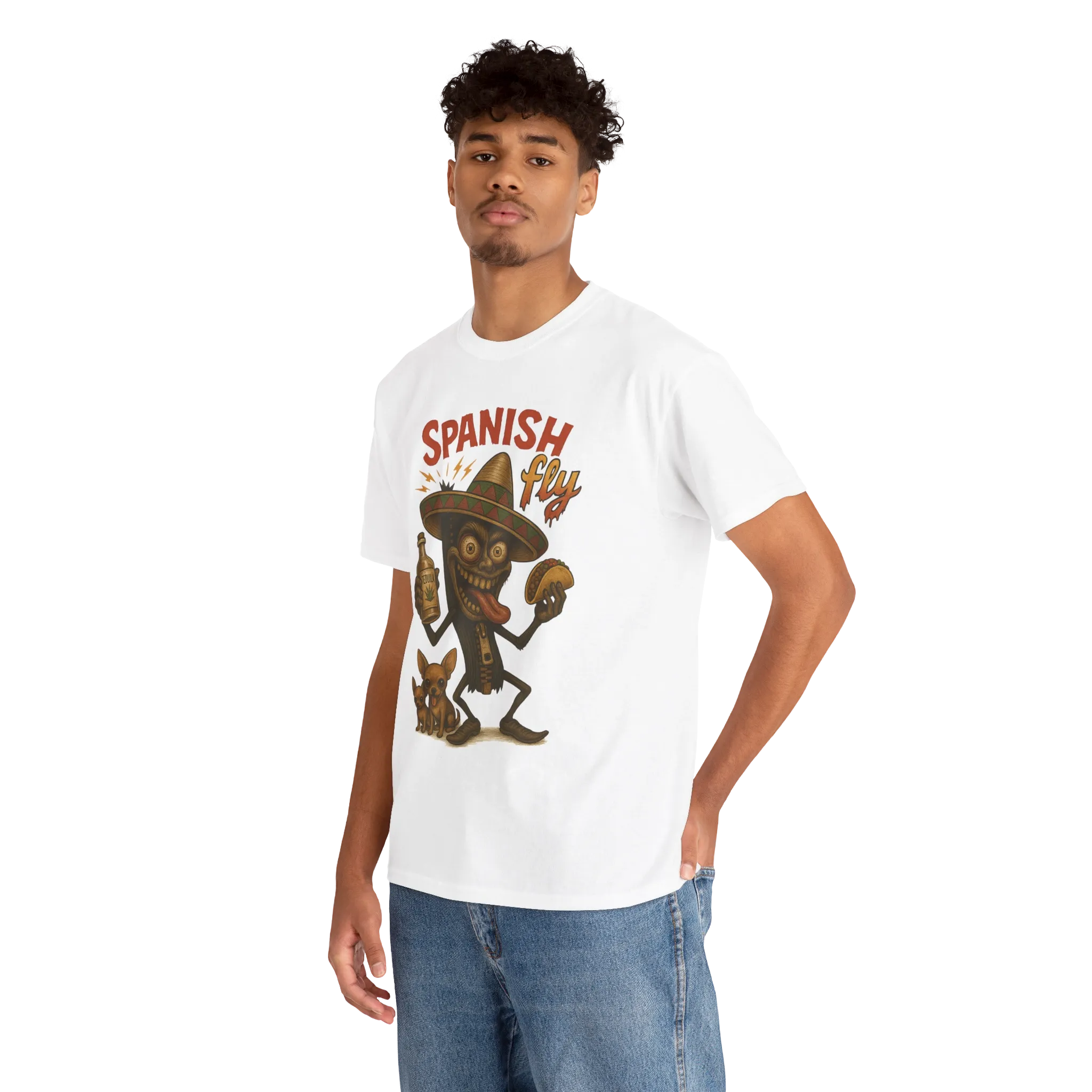 With a sombrero-topped insect holding a taco and a bottle of questionable tequila, this shirt is pure party chaos.