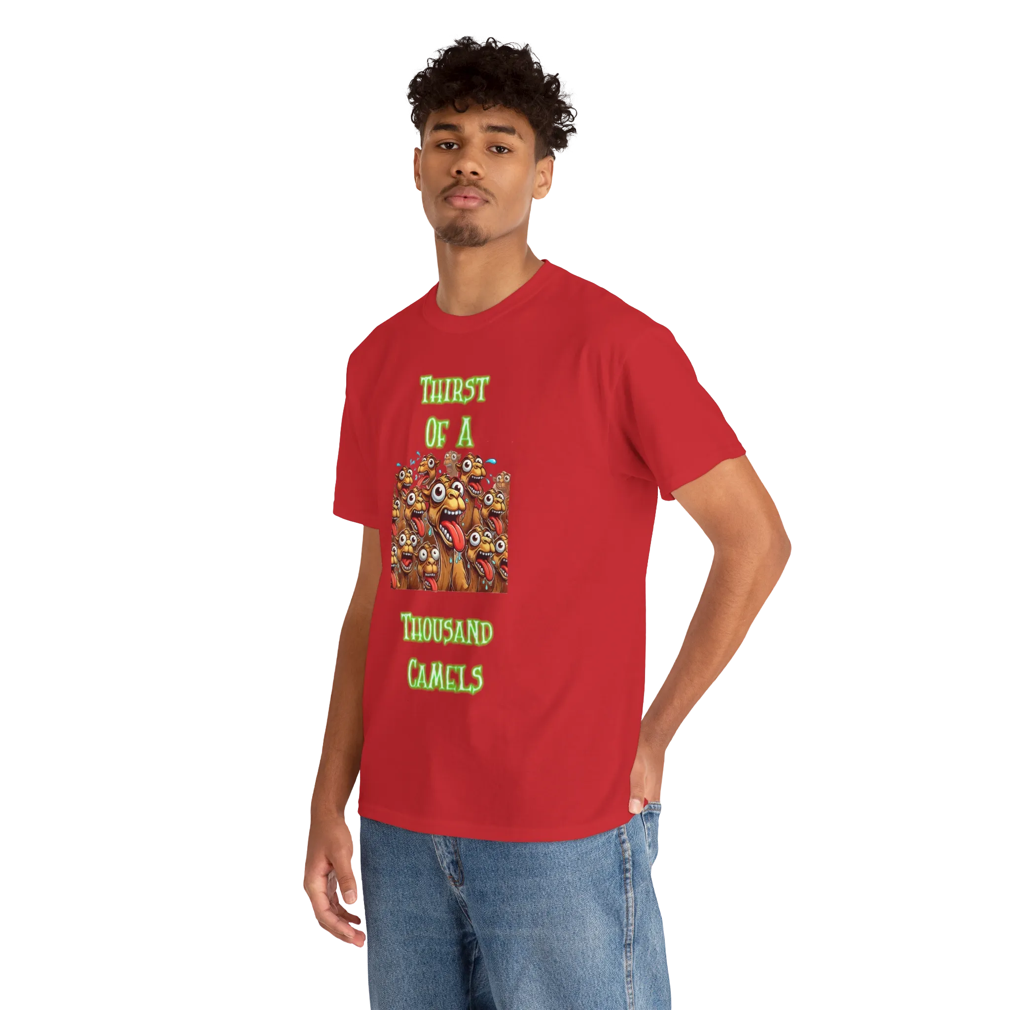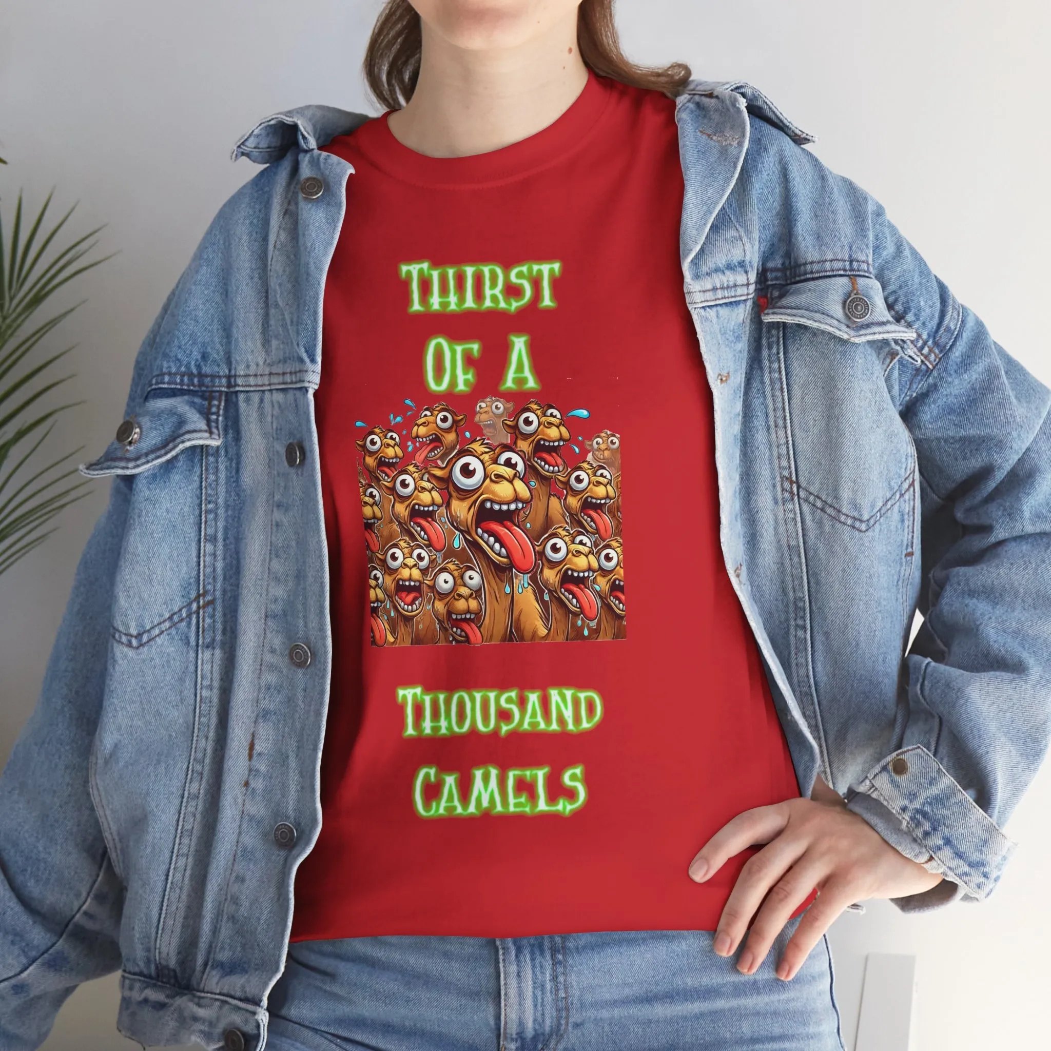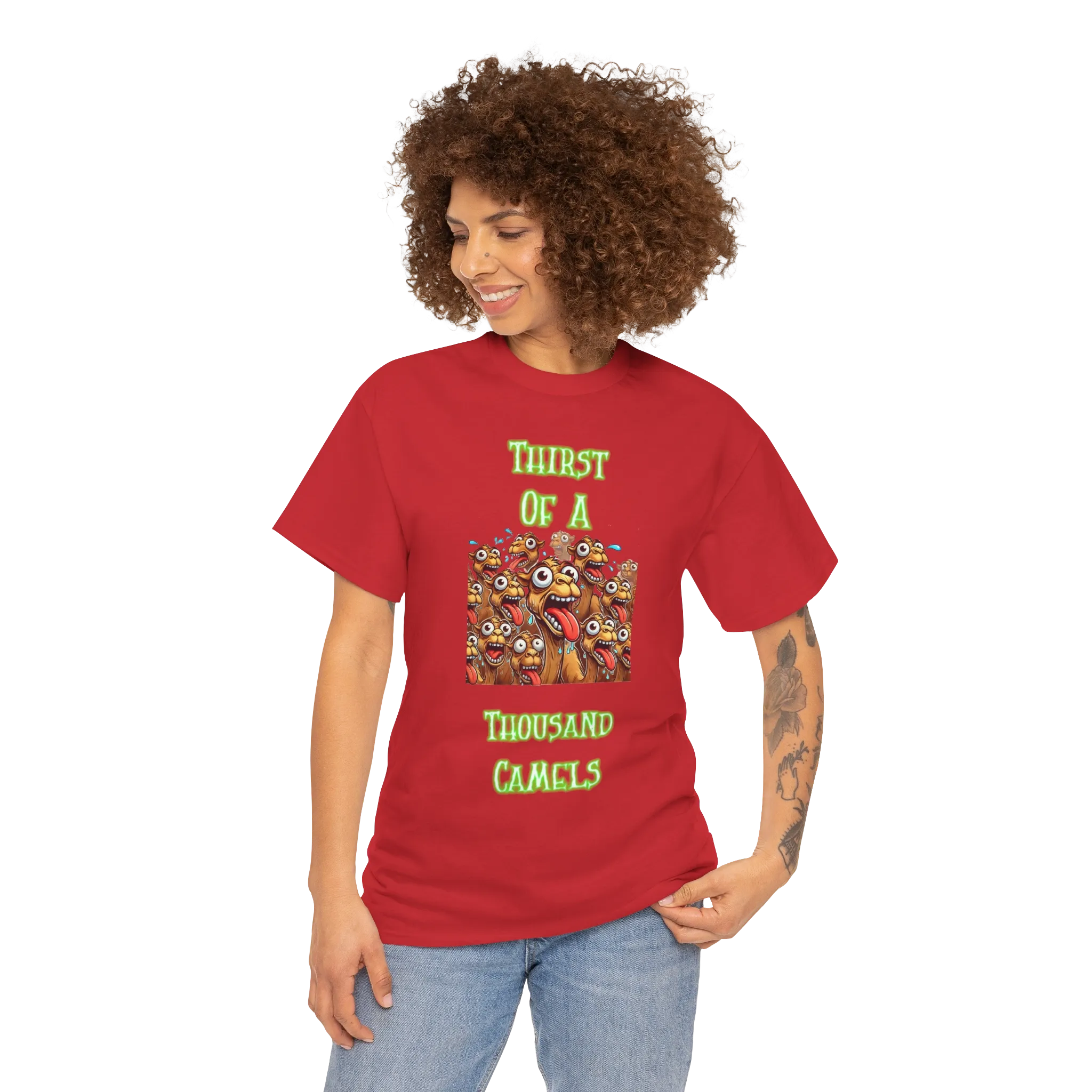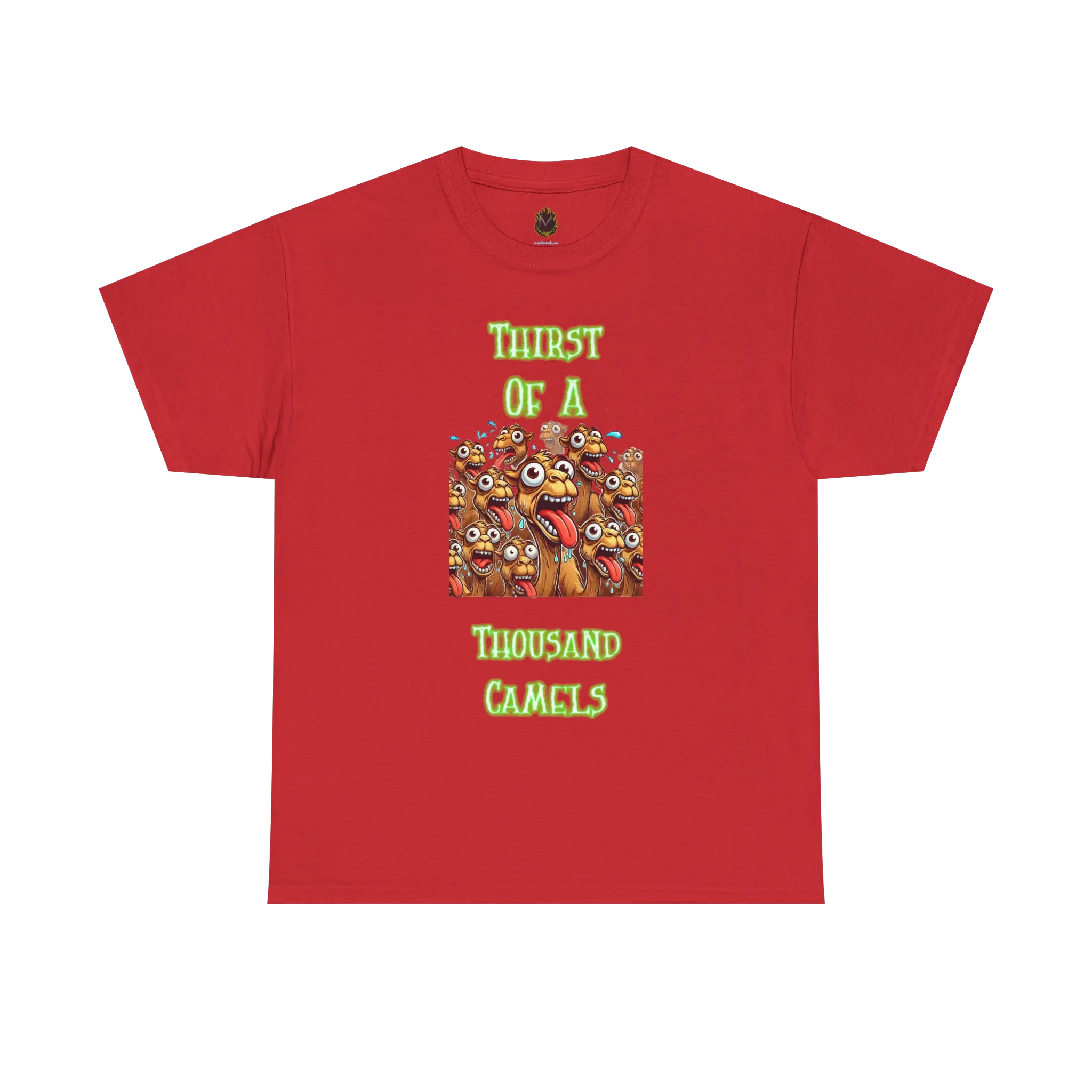 Quench your thirst for weird with this wild design featuring a chaotic crowd of cartoon camels, eyes bulging and tongues out, under the bold phrase “Thirst of a Thousand Camels.” It’s loud, it’s unhinged, and it’s the perfect way to express how drained you feel — emotionally, physically, or just plain thirsty.