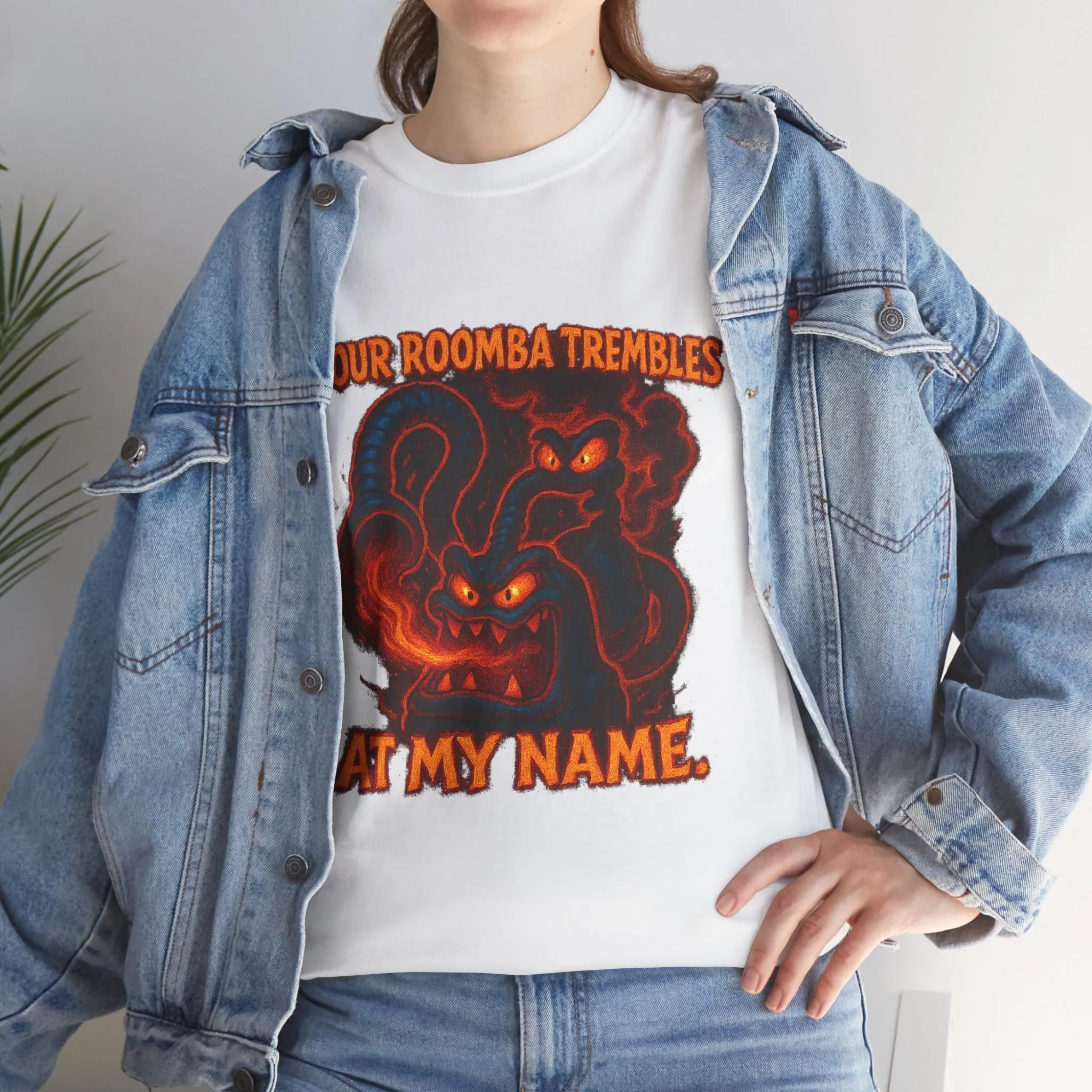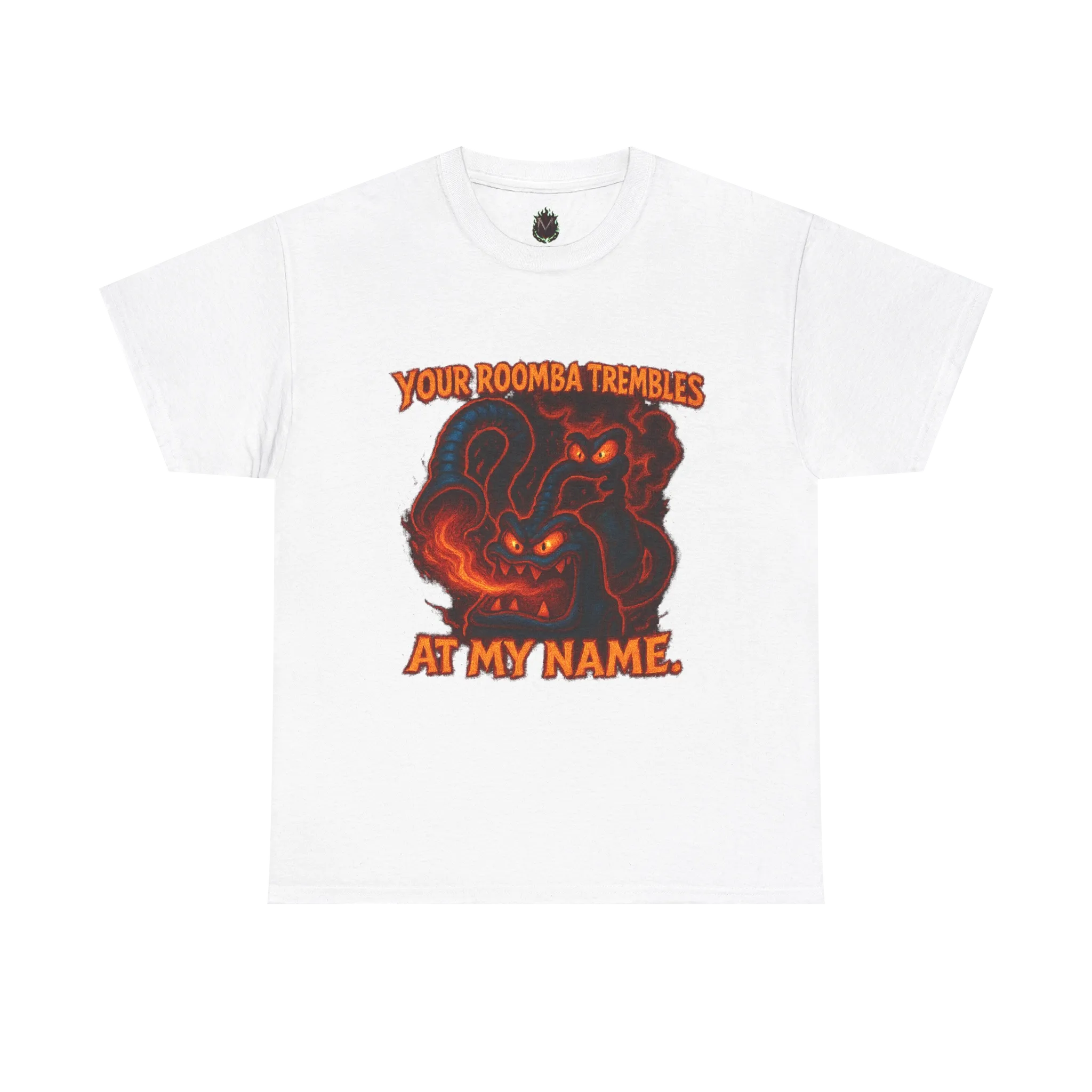 This design features a possessed, furious vacuum creature mid-rampage, paired with the phrase “Your Roomba Trembles At My Name.”