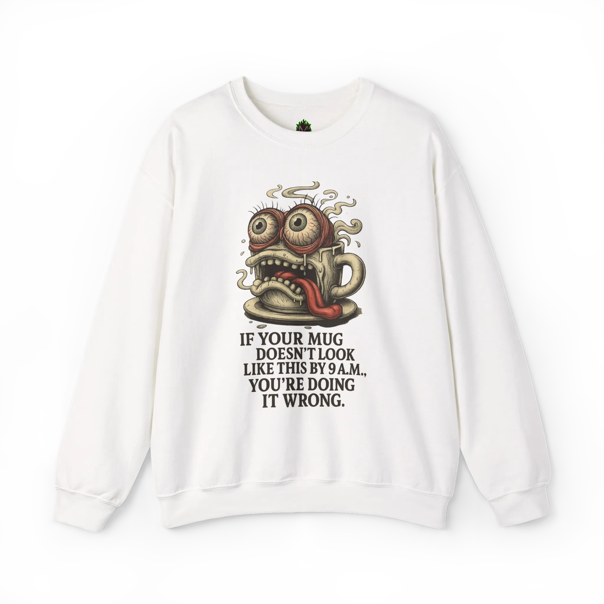 Your morning mug should match your soul—exhausted, twitchy, and slightly unhinged. This white crewneck showcases a wild-eyed coffee cup with its tongue hanging out, steam spiraling like bad decisions. Beneath it, the brutally honest truth: