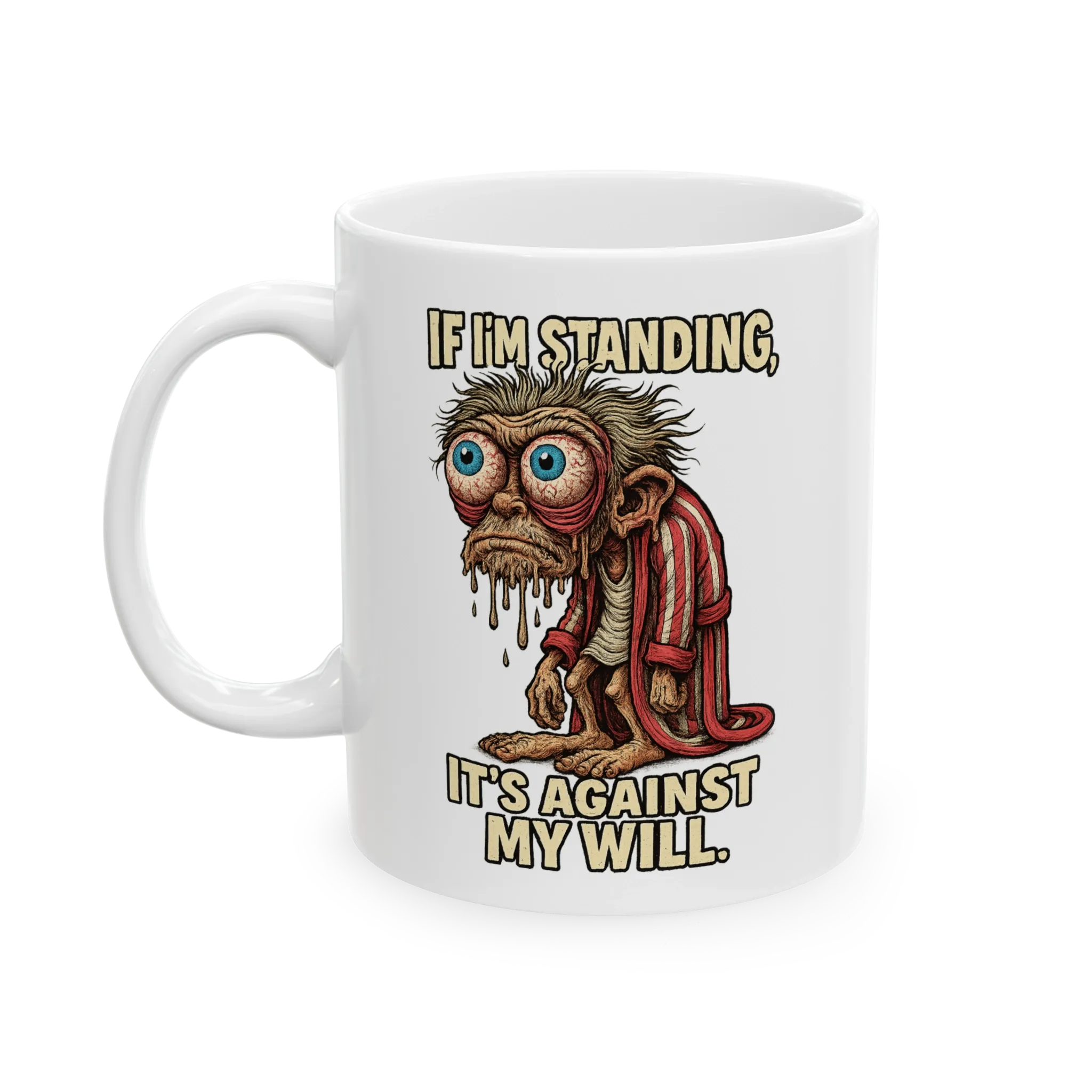It stars a zombified pajama goblin, soaked in sweat, eyeballs halfway out of their sockets, clinging to a crusty bathrobe and will to live. His slouch? Legendary. His stare? Hollow. His energy? Nonexistent.