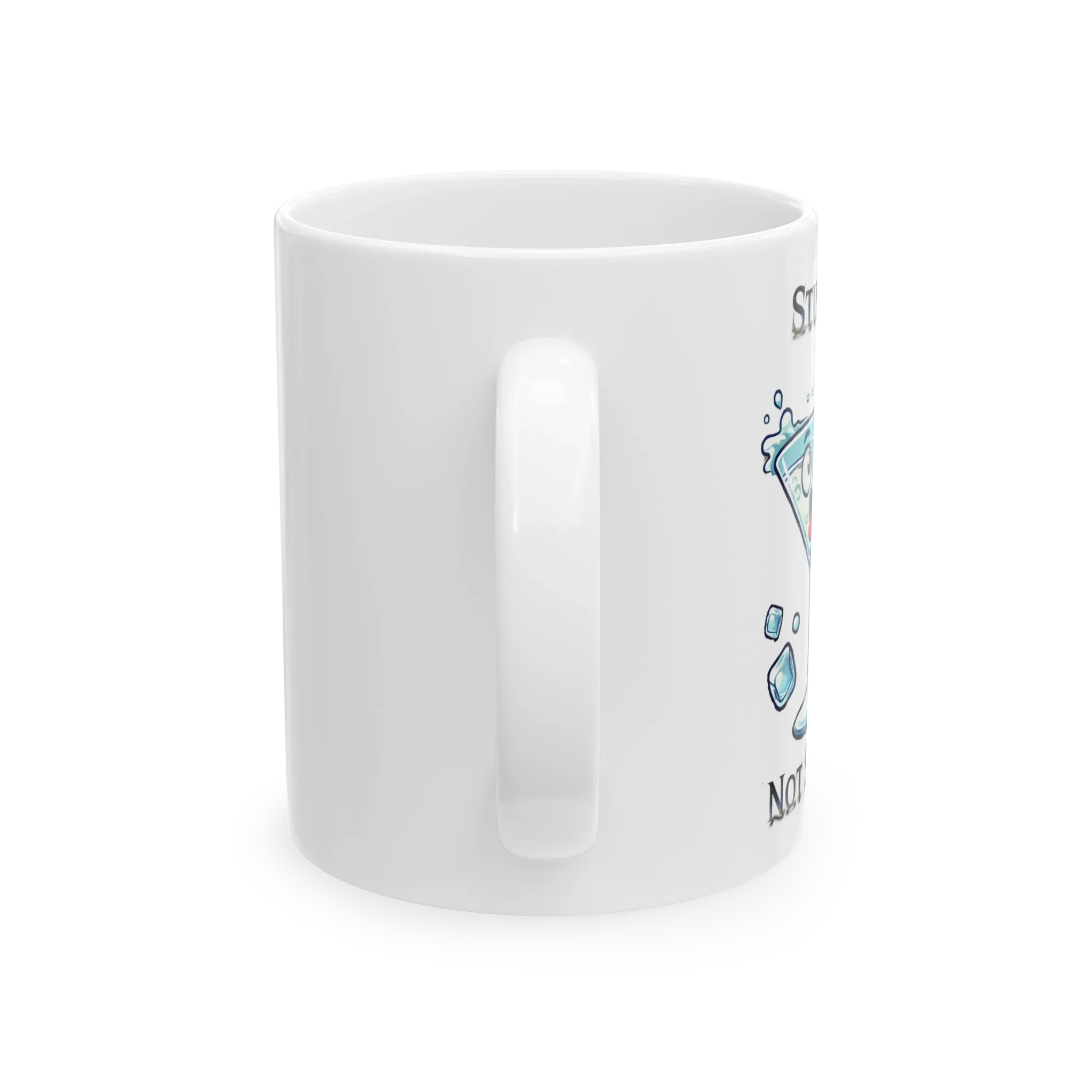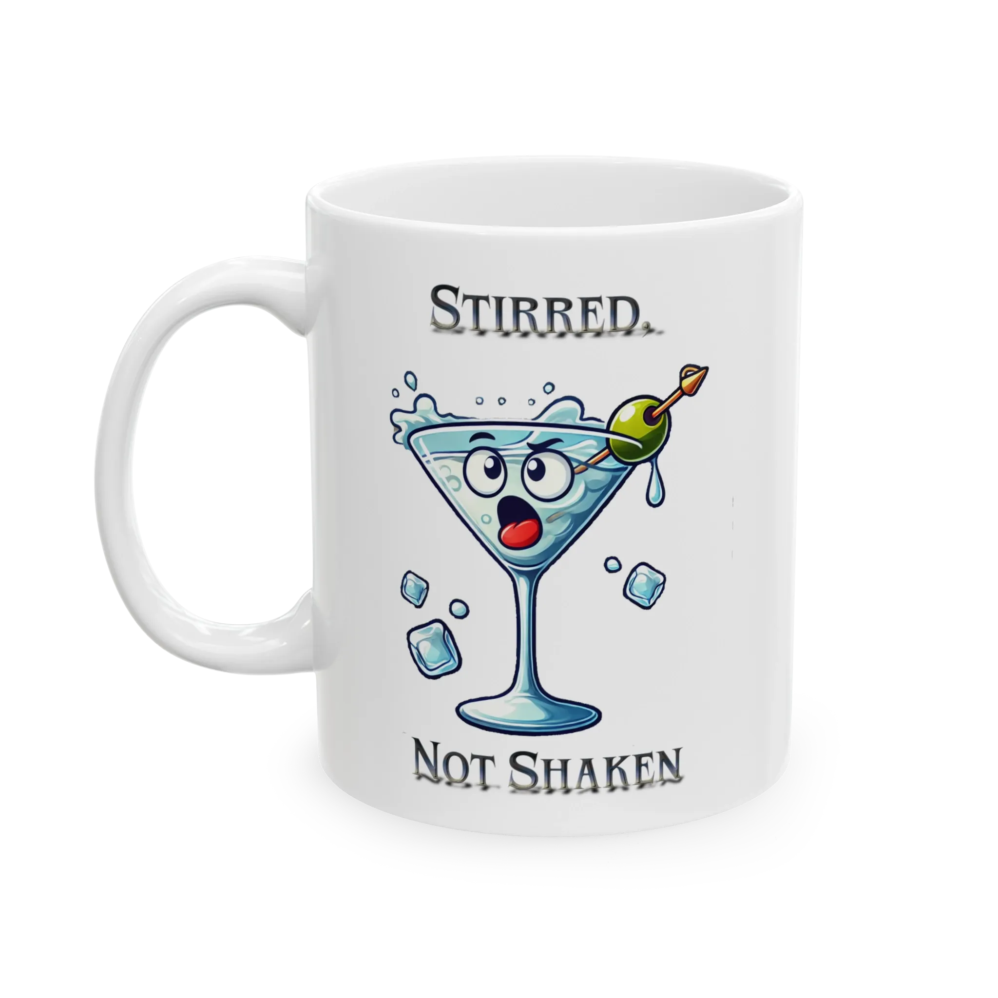 Who needs James Bond when your drink's already seen enough? This mug features a wide-eyed martini glass with a serious attitude—ice flying, olive skewered, and expression furious. Above and below it reads: