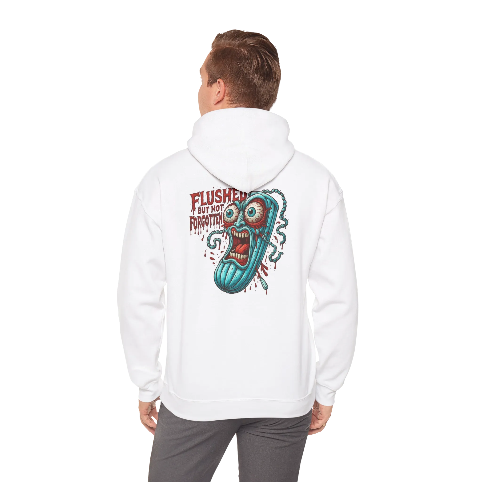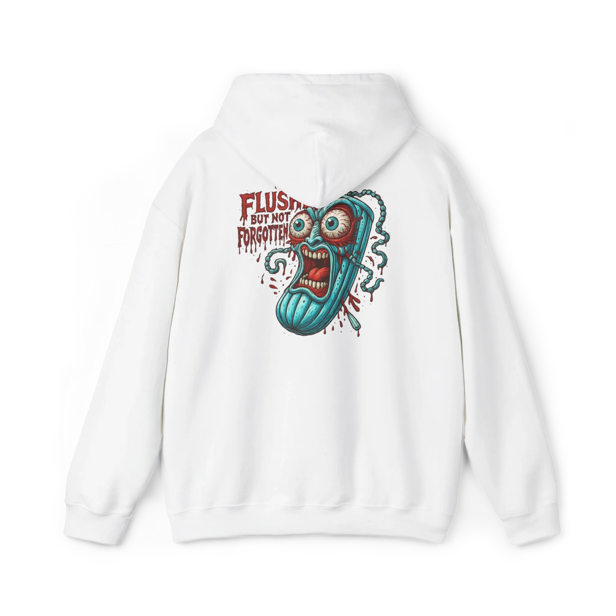 This hoodie blends grotesque art with twisted comedy, turning a sanitary pad into a blood-soaked nightmare cartoon. With bugged-out eyes, a manic grin, and the unforgettable phrase “Flushed But Not Forgotten,” this design is both disturbing and hilarious.