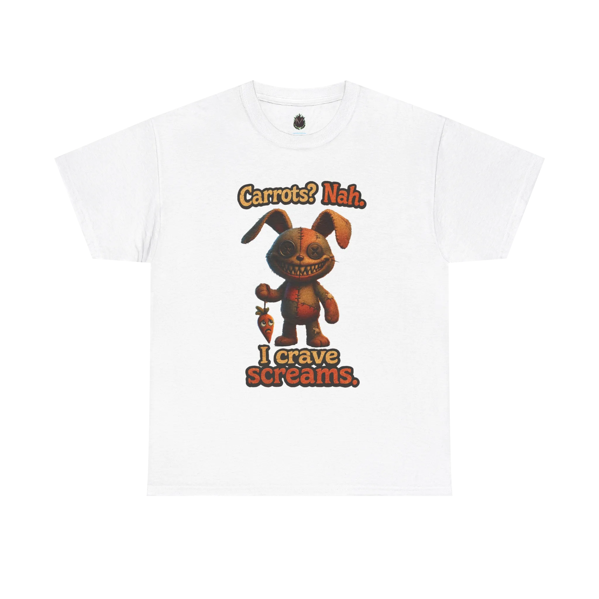 Featuring a stitched, deranged rabbit holding an unfortunate snack beneath the phrase “Carrots? Nah. I Crave Screams,” this shirt blends absurdity, dark humor, and cheerful menace into one unforgettable graphic.