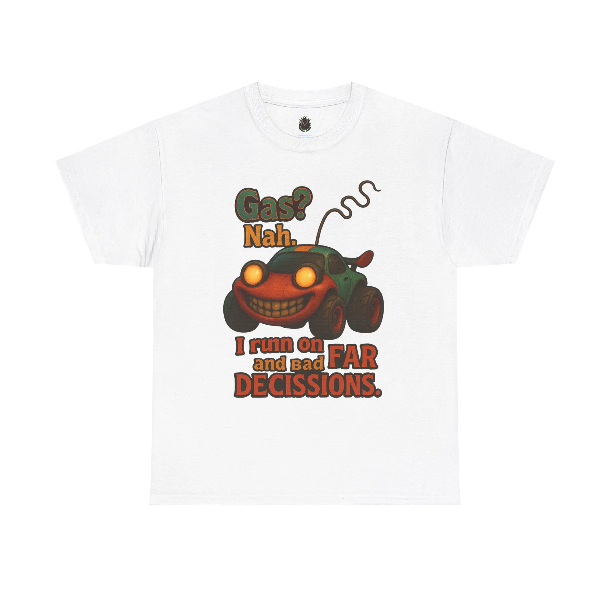 Featuring a manic little car character paired with the phrase “Gas? Nah. I Run on Caffeine and Bad Decisions.”, this design is for anyone whose life operates on impulse, sarcasm, and barely contained chaos.