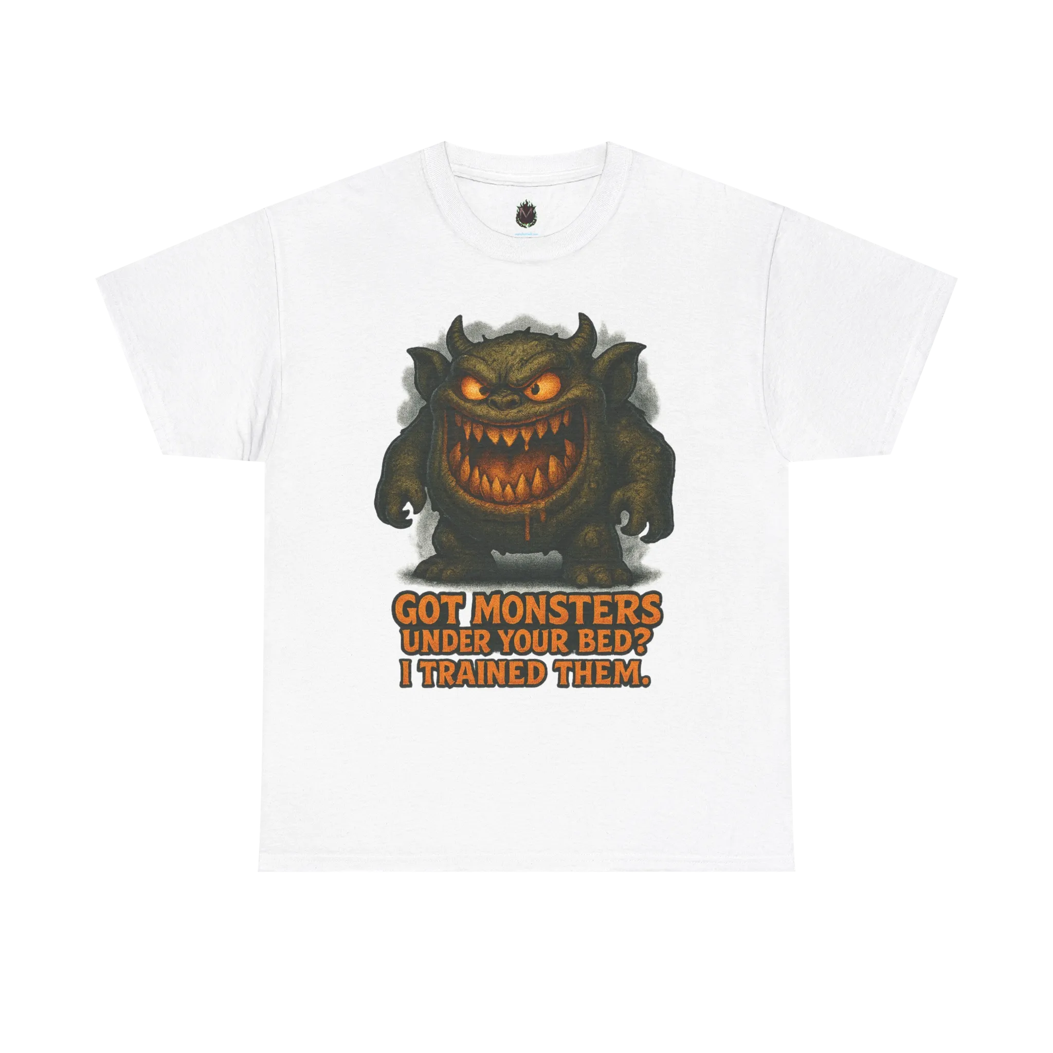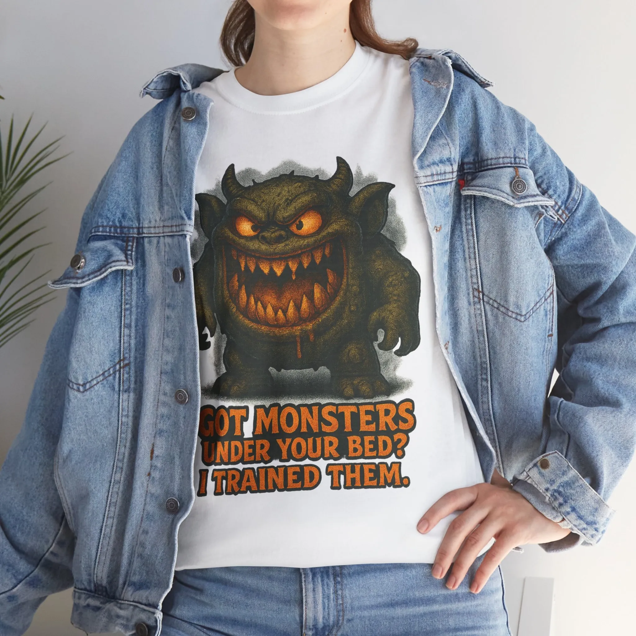 Featuring a snarling monster bursting forward with the phrase “Got Monsters Under Your Bed? I Trained Them.”, this shirt delivers dark humor with unapologetic confidence.