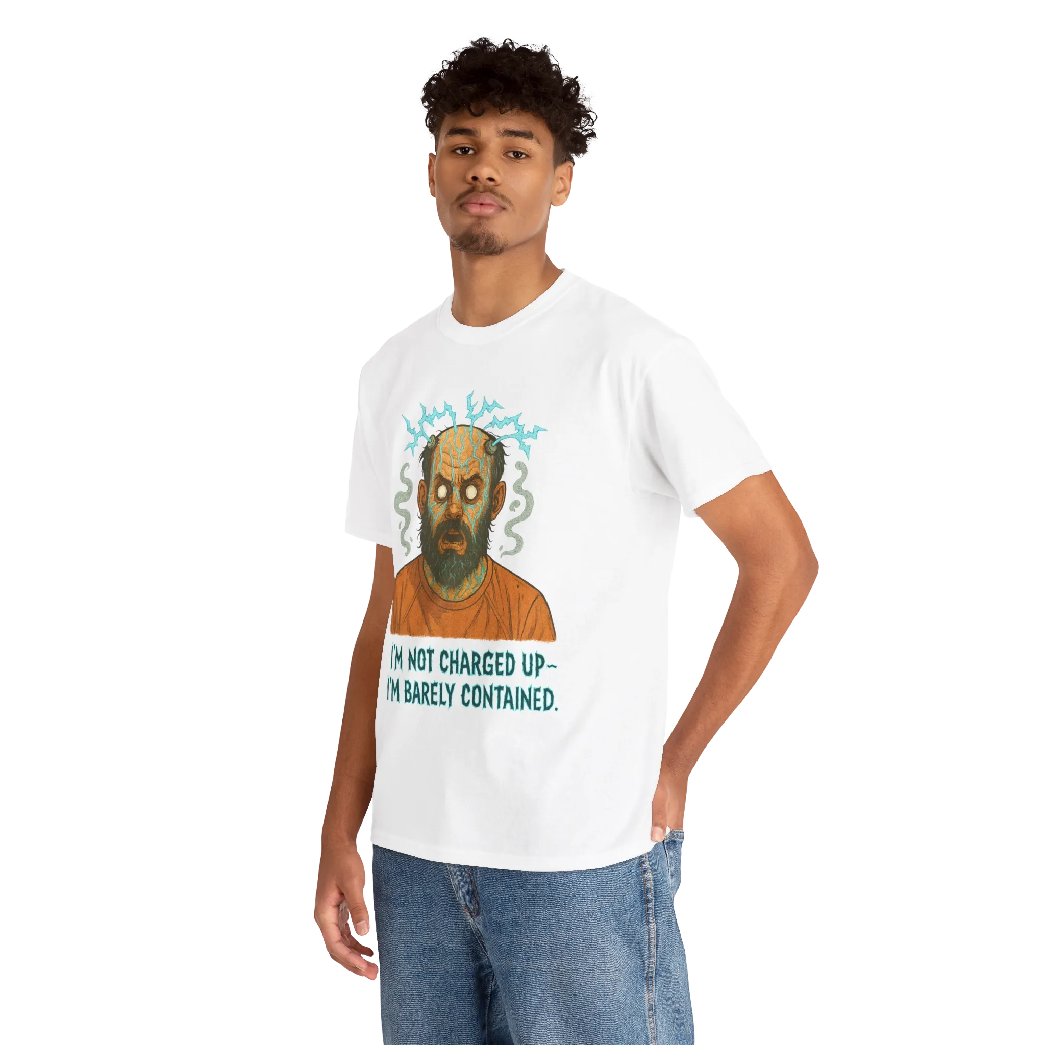 Featuring an intense, overstimulated figure and the phrase “I’m Not Charged Up. I’m Barely Contained.”, this design speaks to burnout, overload, and the thin line between holding it together and losing it entirely.