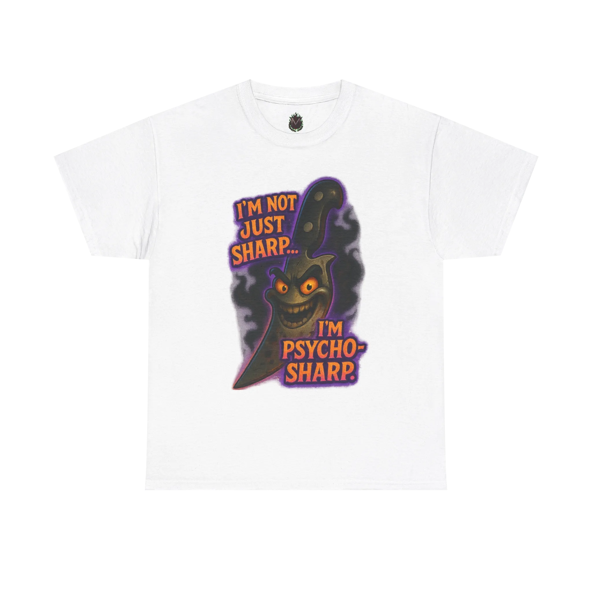 This design features a grinning, sentient knife that has clearly crossed from practical tool into unhinged enthusiasm, paired with the phrase “I’m Not Just Sharp… I’m Psycho-Sharp.”