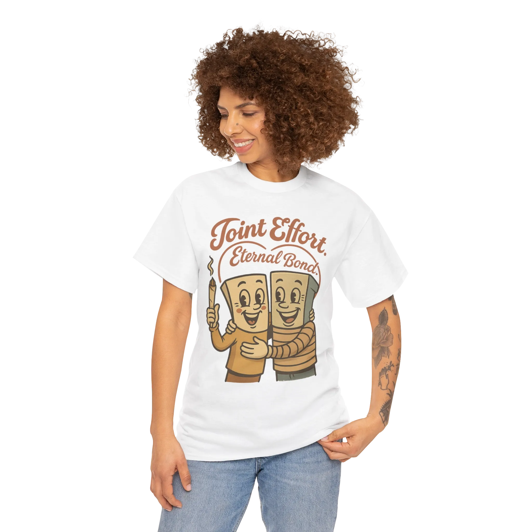 Celebrate the high times and the higher friendships with this nostalgic-style tee featuring two vintage cartoon rolling papers, smiling and sharing a hug—one holding the sacred joint that keeps them united.