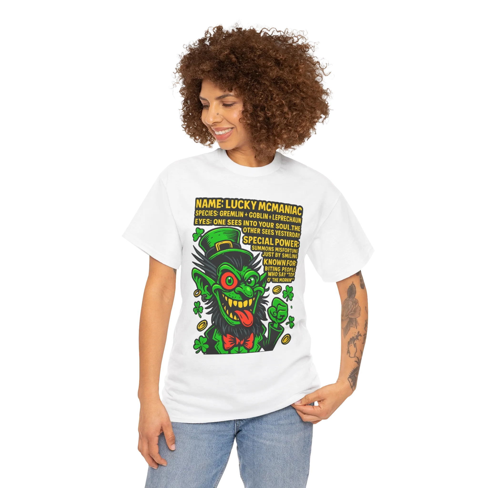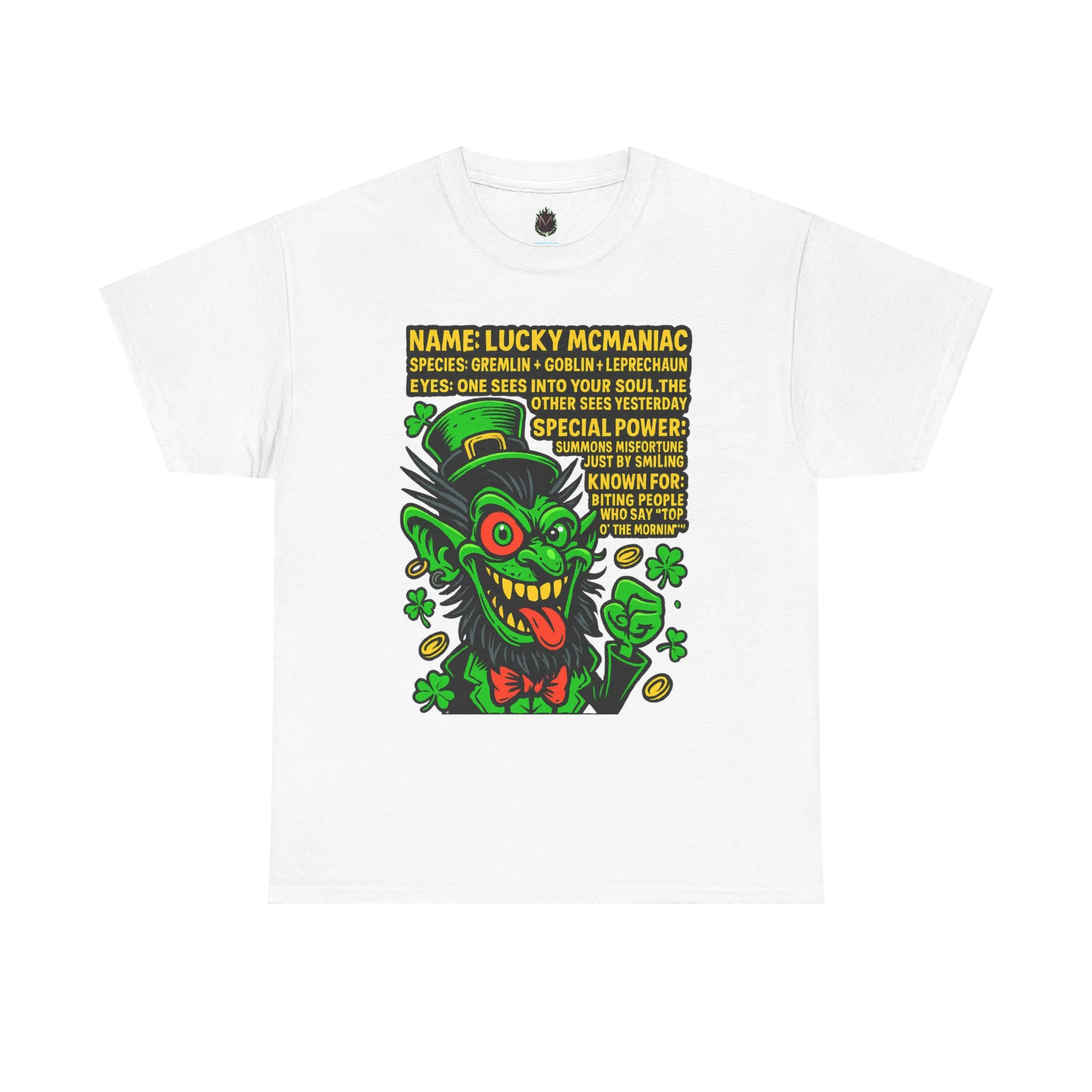 Say hello (or don’t) to Lucky McManiac, a chaotic hybrid with leprechaun vibes and gremlin rage. He smiles? You crash your car. You say “Top o’ the mornin’”? He bites. This is the kind of shirt that screams “I have a weird energy and no regrets.”