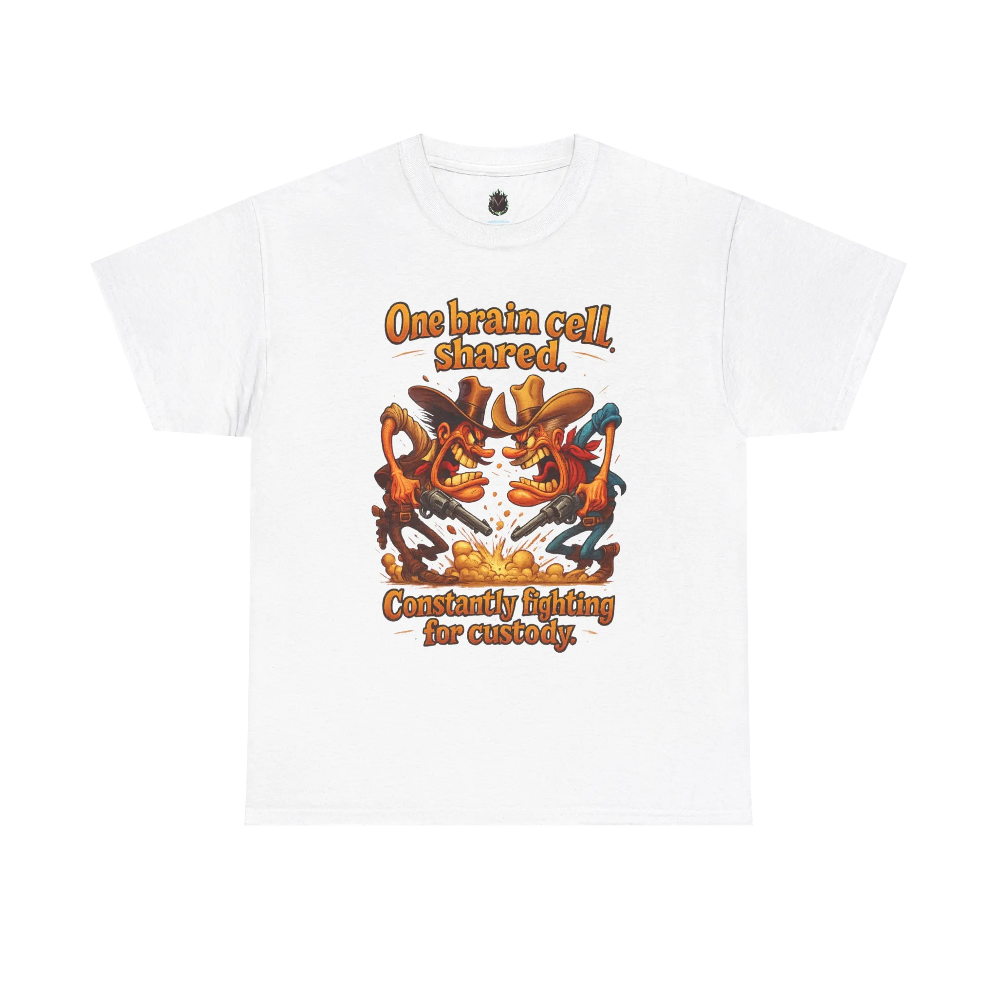 Featuring two unhinged characters locked in an eternal standoff beneath the phrase “One Brain Cell Shared, Constantly Fighting for Custody,” this shirt is a visual representation of poor decisions, loud arguments, and mutual incompetence.