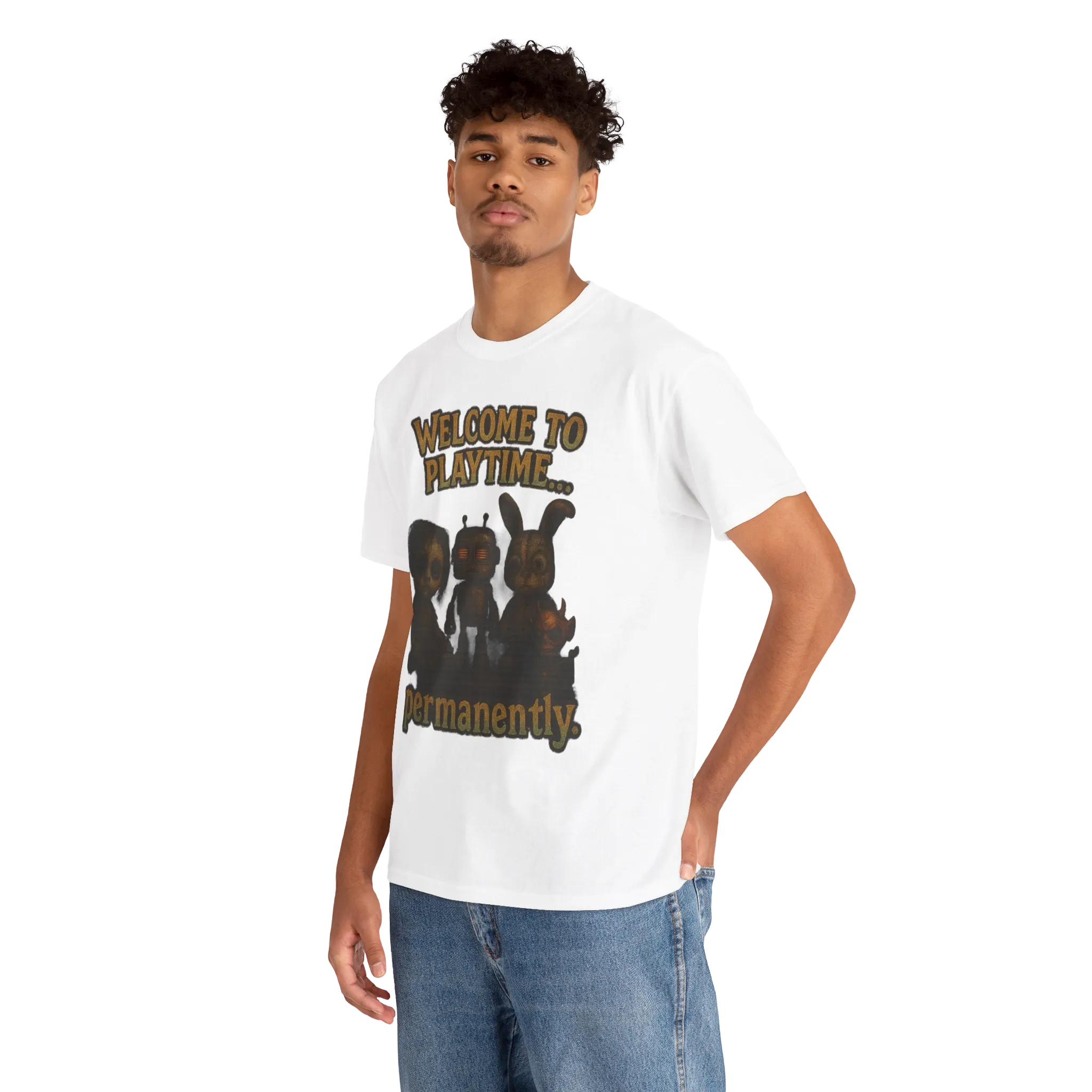This design features a lineup of unsettling toy figures beneath the phrase “Welcome to Playtime… permanently.”